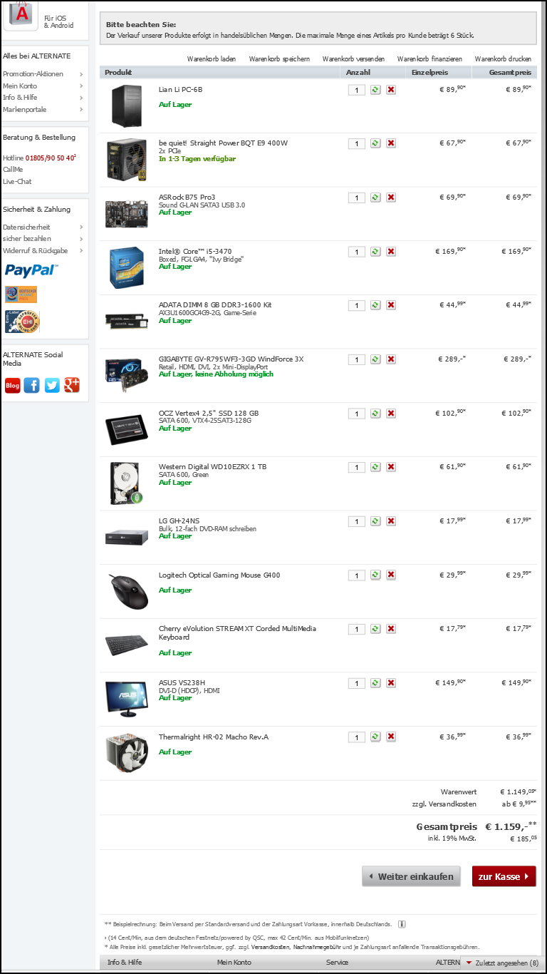 Alternativ könnte man hier ein Netzteil mit KM nehmen, 1600 RAM, einen besseren CPU Kühler oder eine größere SSD. Oder eine Gaming Tastatur (x4 Sidewinder). Je nachdem worauf man hier wert legt. Das kann uns aber nur der TE beantworten.