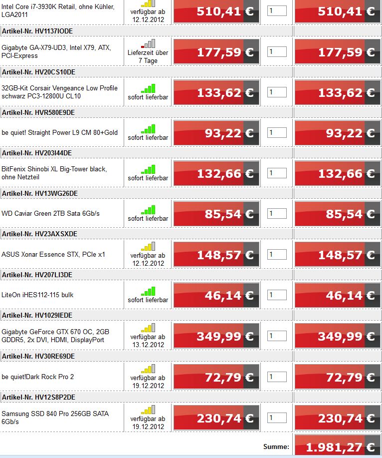 (2 in RAID 0 + SSD Raid 0 vorhanden )= Festplatte 120 GB SSD Corsair Force3, sowie Grafikkarte GTX 550TI werden aus dem alten Rechner übernommen und sind soweit ausreichend.