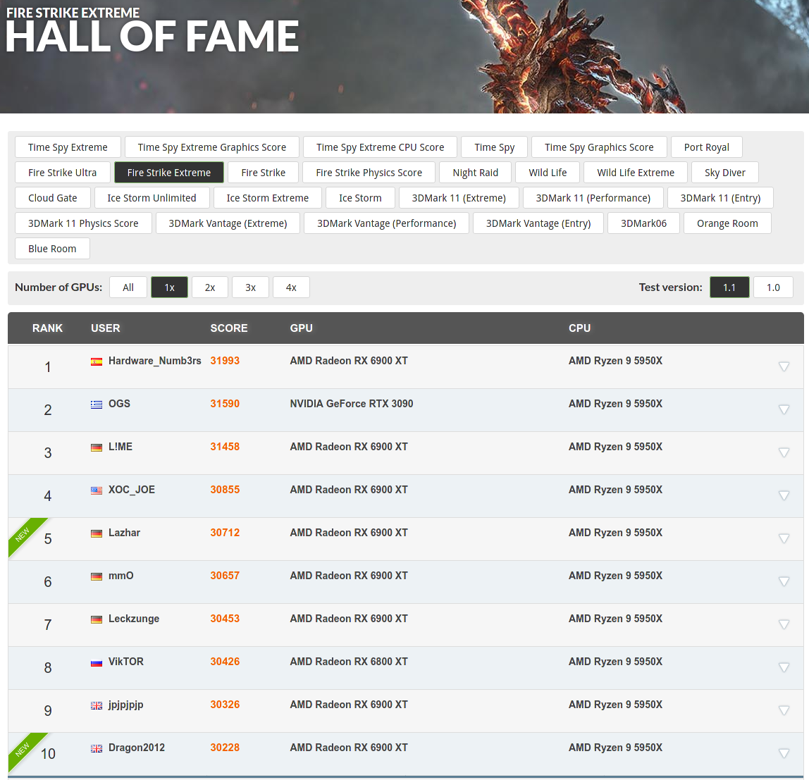 Was ich aber nicht verstehe, sind die Hall of Fame Listen. Hier sind in den Top-10 nur AMD-Karten, bei 3DMark ist nur eine AMD-Karte on top direkt gefolgt von NVidia, aber dieses Ergebnis hier erscheint dort nicht.