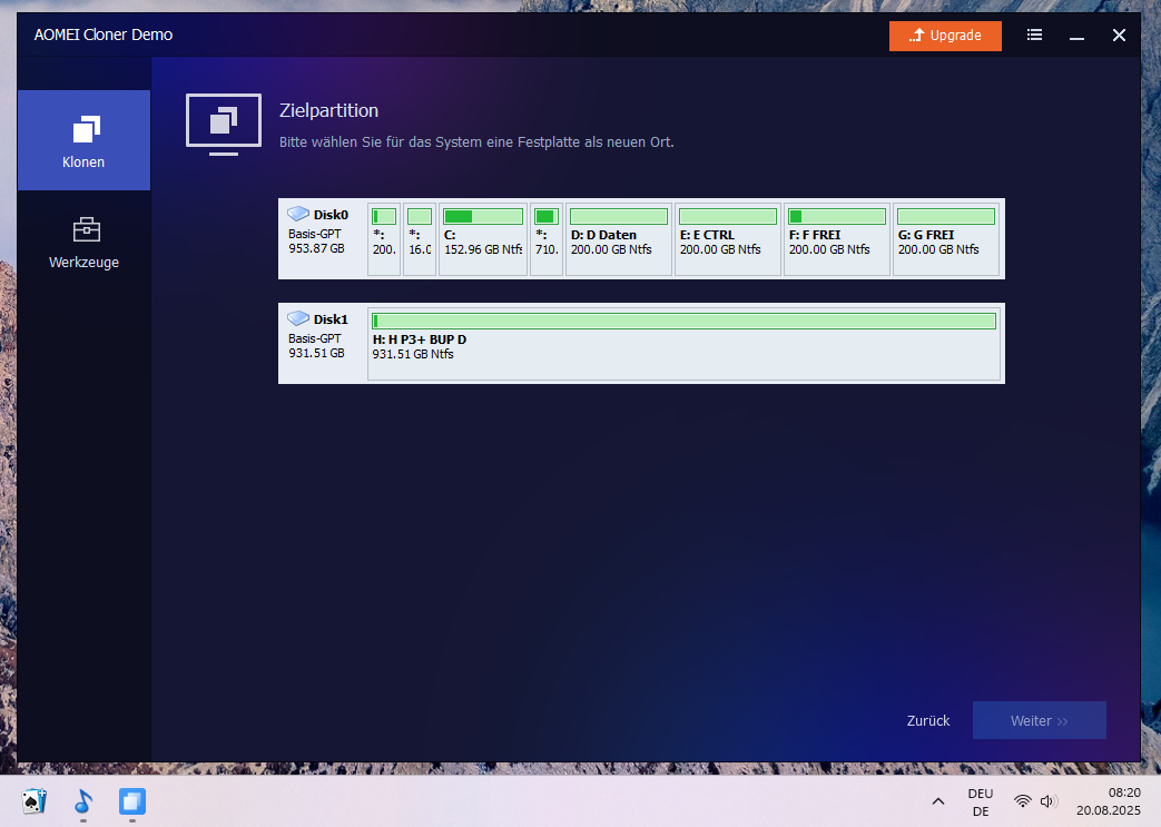 2. von dem Stick den neuen Laptop gebootet, Aomei wurde automatisch gestartet