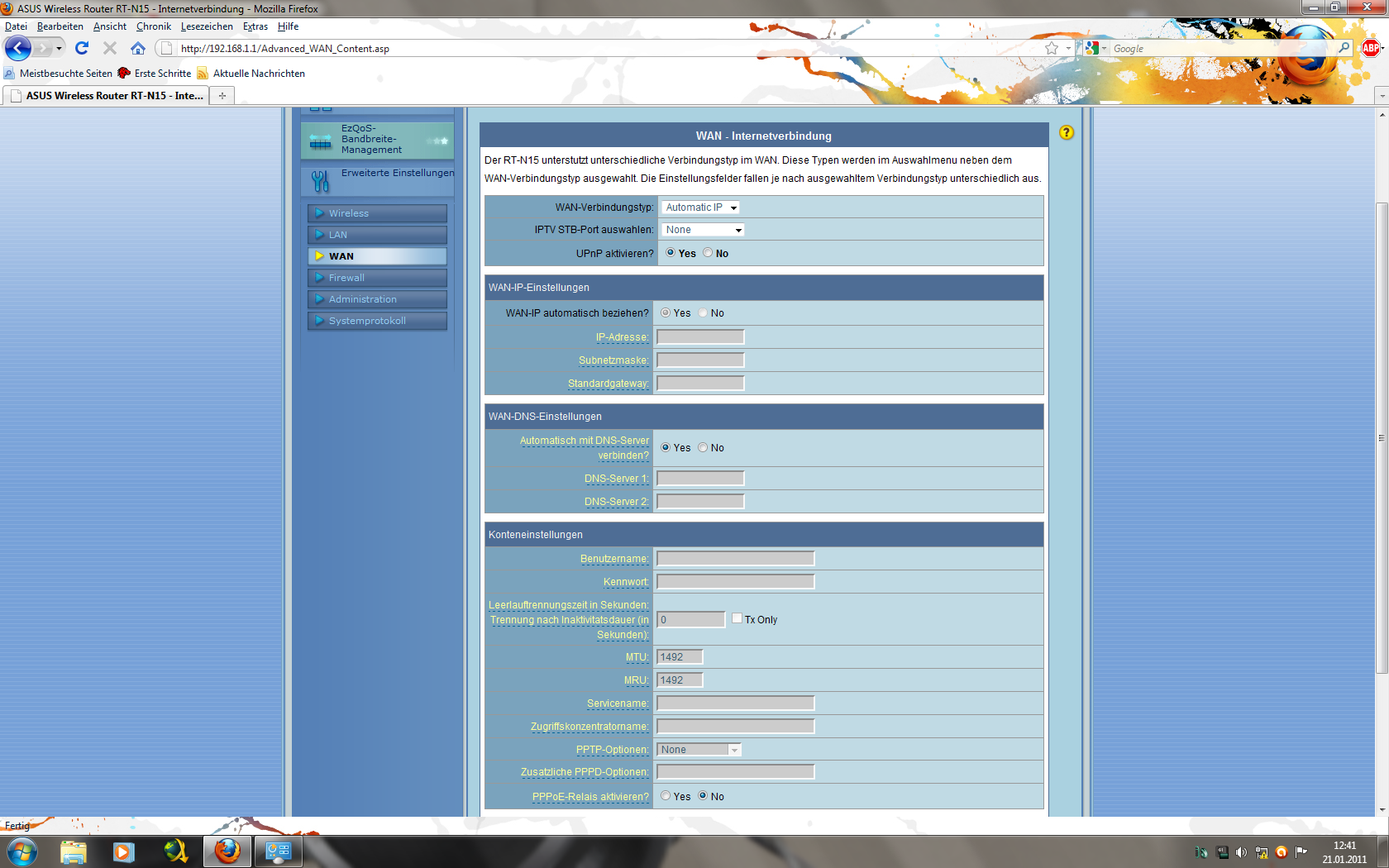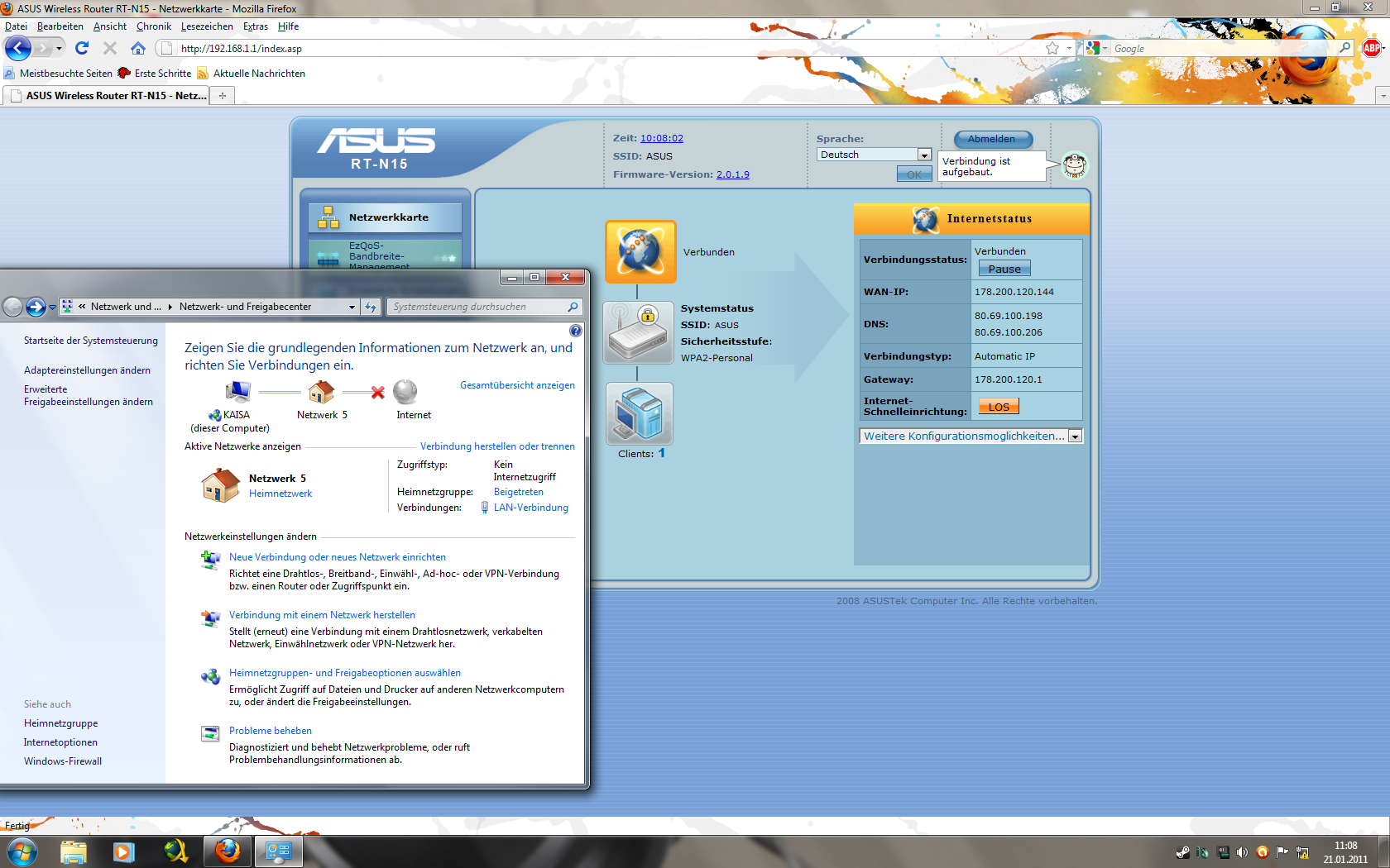 ALso kurz informiert und den WLAN-Router Asus RT-N15 gekauft. Damit sollte es möglich sein, über WLAN mit dem Internet zu verbinden sowie bis zu vier Geräte per Kabel anzuschliessen.