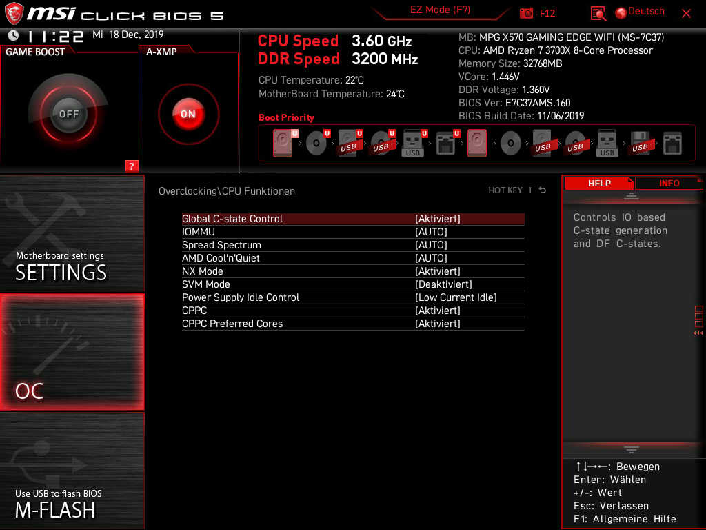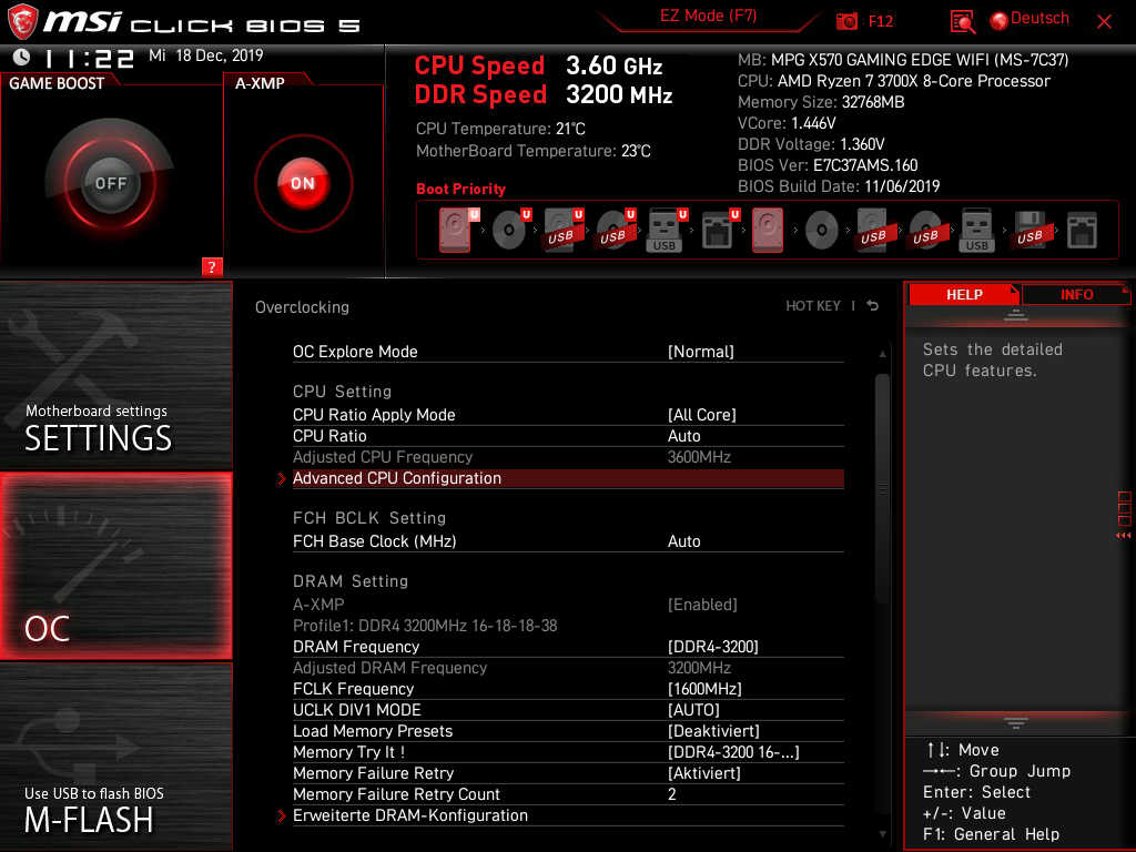 Unten ein paar Screenshots vom Bios. Ich denke das es gerade im Bereich „CPU Funktionionen“ etwas Optimierungsbedarf gibt.