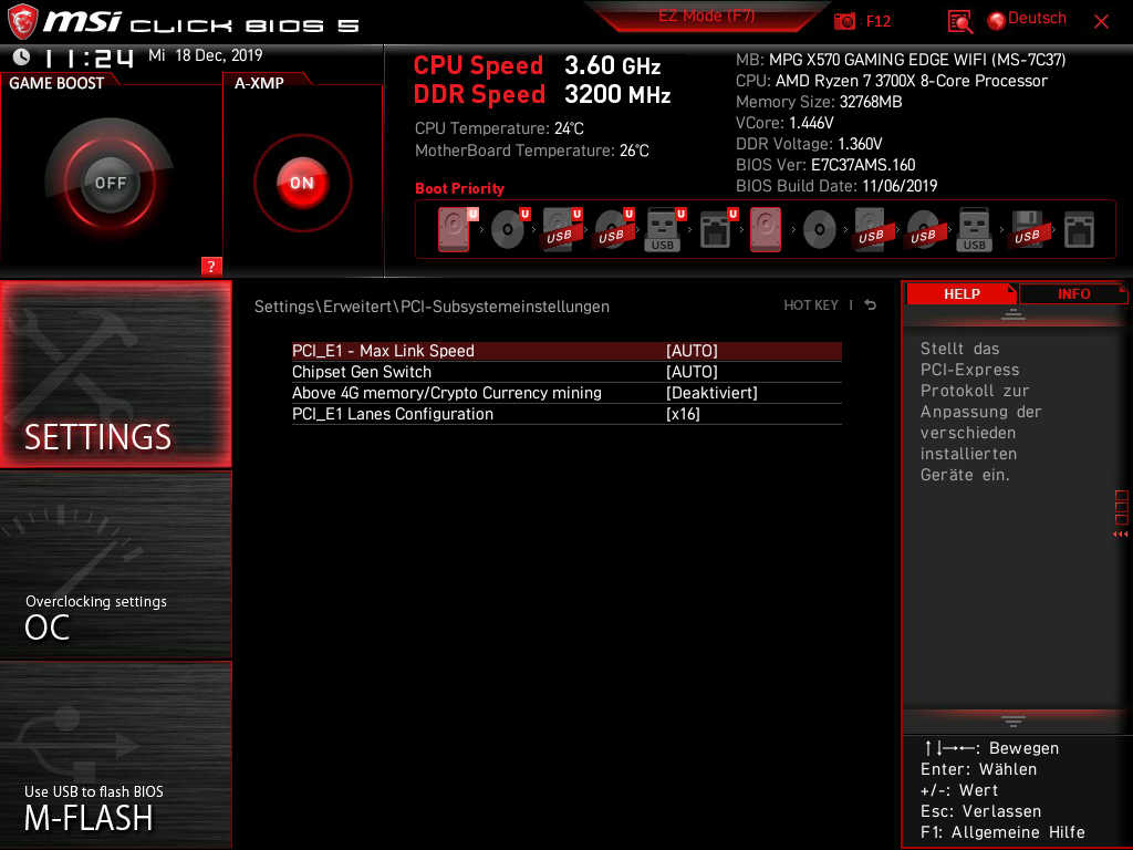 Bei „PCI-Einstellungen“ habe ich auf Gen4 eingestellt (ist im Bild noch auf „auto“).