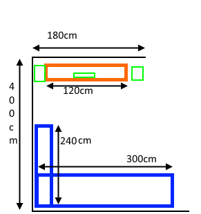 Im Anhang noch ein Bild von der Ecke. Blau die Couch, Orange die TV-Bank und Grün die möglichen Boxen