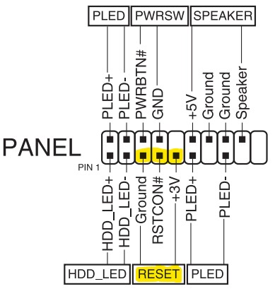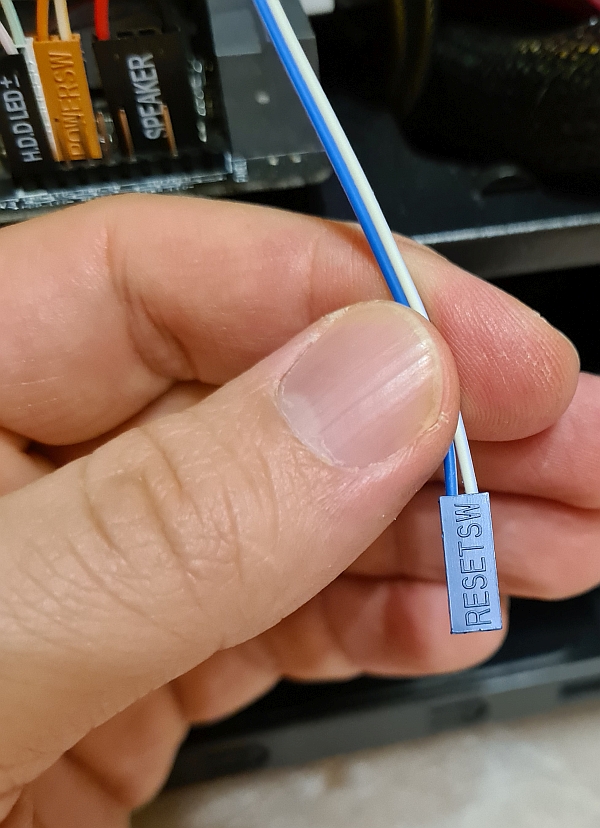 Jetzt stehe ich zum Abschluss des Umbaus vor einem recht skurril Problem: der Reset-Schalter des Gehäuses hat einen 2-Pin-Stecker, aber das Mainboard hat einen 3-Pin-Anschluss für die Reset-Knopf-Funktion!