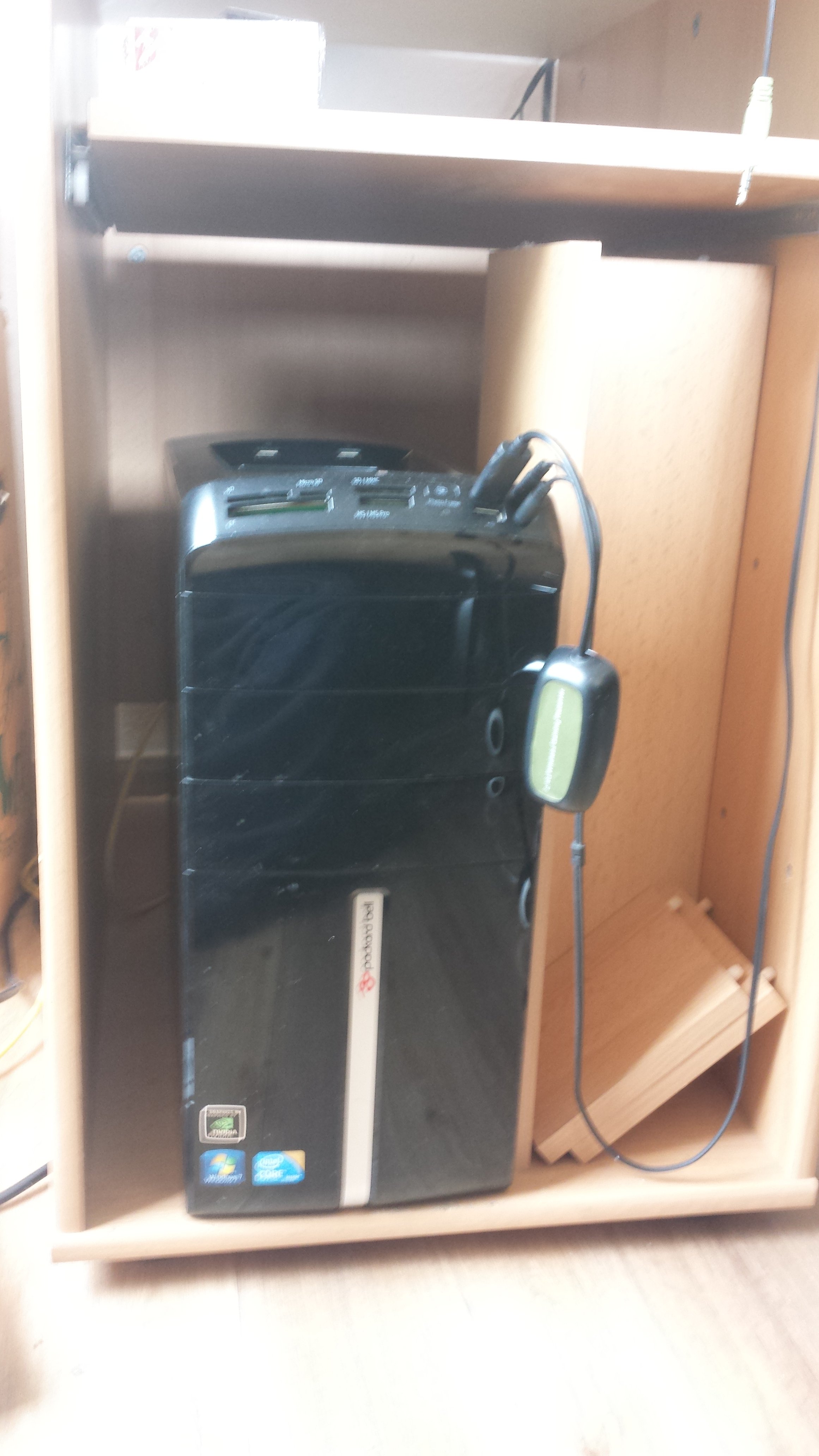 Das Problem ist nämlich, dass der Rechner zur linken Seite nur rund 4-5 cm vom nächsten Holzbrett entfernt ist und sich hier die Hitze stauen könnte. Genutzt wird der Rechner dabei durchaus zum spielen, wenn auch nicht mit High End Komponenten oder den neusten der neusten Spielen.