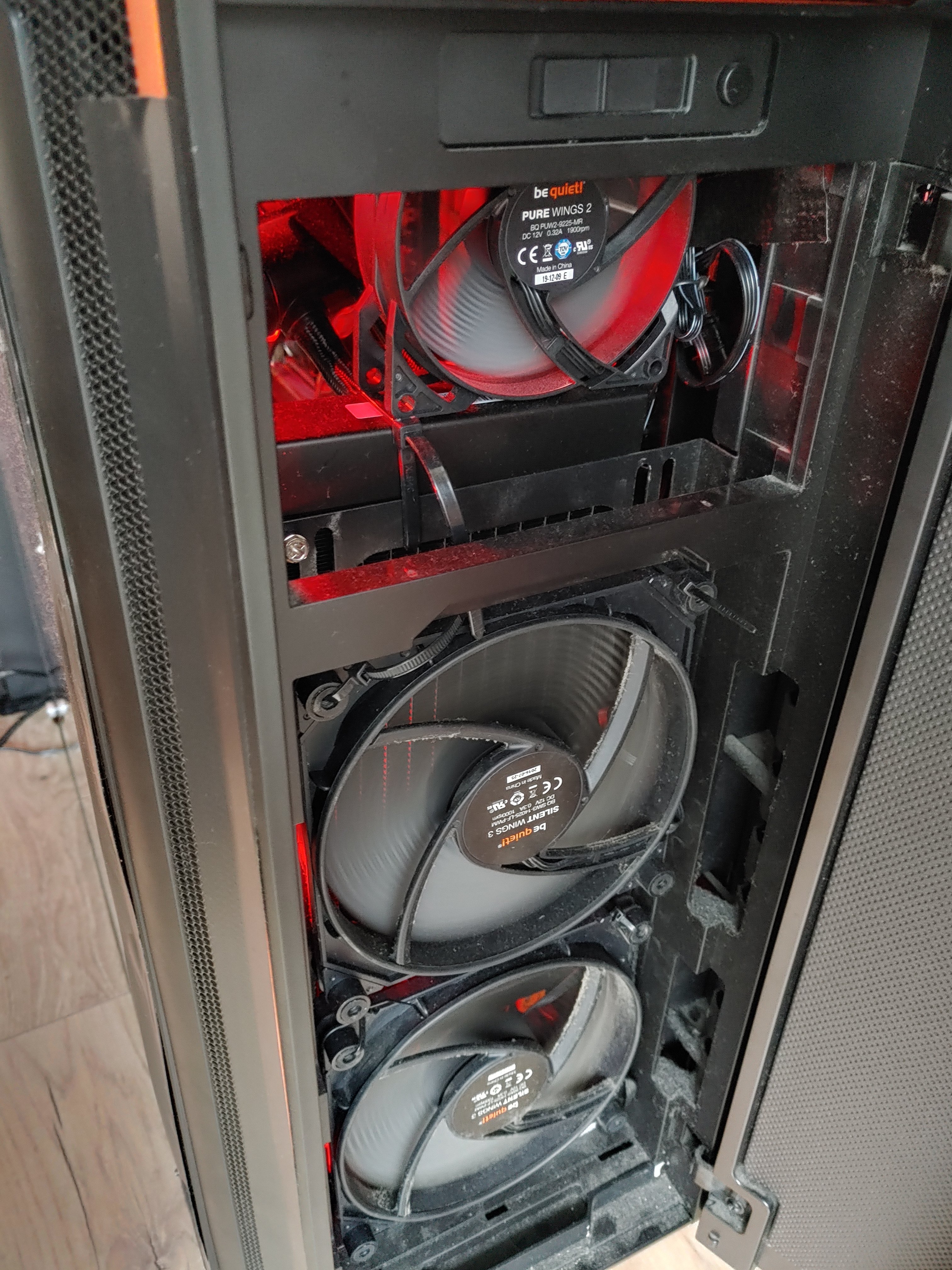 da ich dazu nichts gefunden habe, wollte ich hier mal nachfragen, ob das Problem bekannt ist. Ich hab mir das Dark Base Pro 900 Rev.2 geholt in der Hoffnung, mal einen leiseren PC zu haben. Zusätzlich zu den 3 mitgelieferten Silent Wings 3 hab ich noch 2x Corsair LL120 unten und 3x Pure Wings 2 mit Radiator oben eingebaut. Insgesamt 8 Lüfter, alle per PWM an der Lüftersteuerung des Gehäuses. CPU läuft mit Wasserkühlung, Grafikkarte nicht.