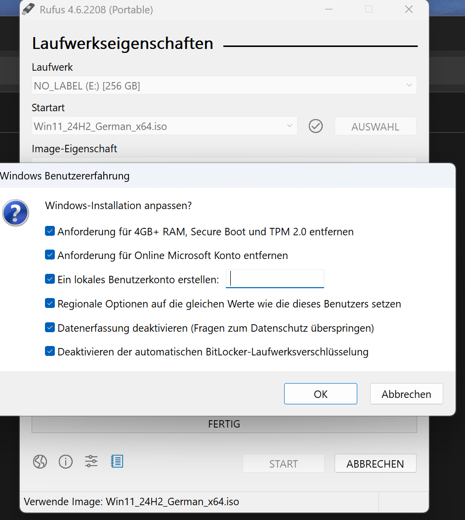 Und Windows 11 kannst du dadrauf auch problemlos installieren. Einfach das Windows 11 Image herrunterladen und mit Rufus auf einen USB Stick bringen und folgende Einstellungen machen.