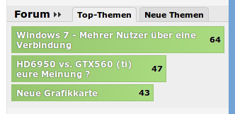 Ich denke wir können in die Forum-Box Tabs einbauen, so dass man zukünftig zwischen "Top-Themen" und "Neue Themen" wählen kann (Screenshot eines Entwurfs im Anhang).
