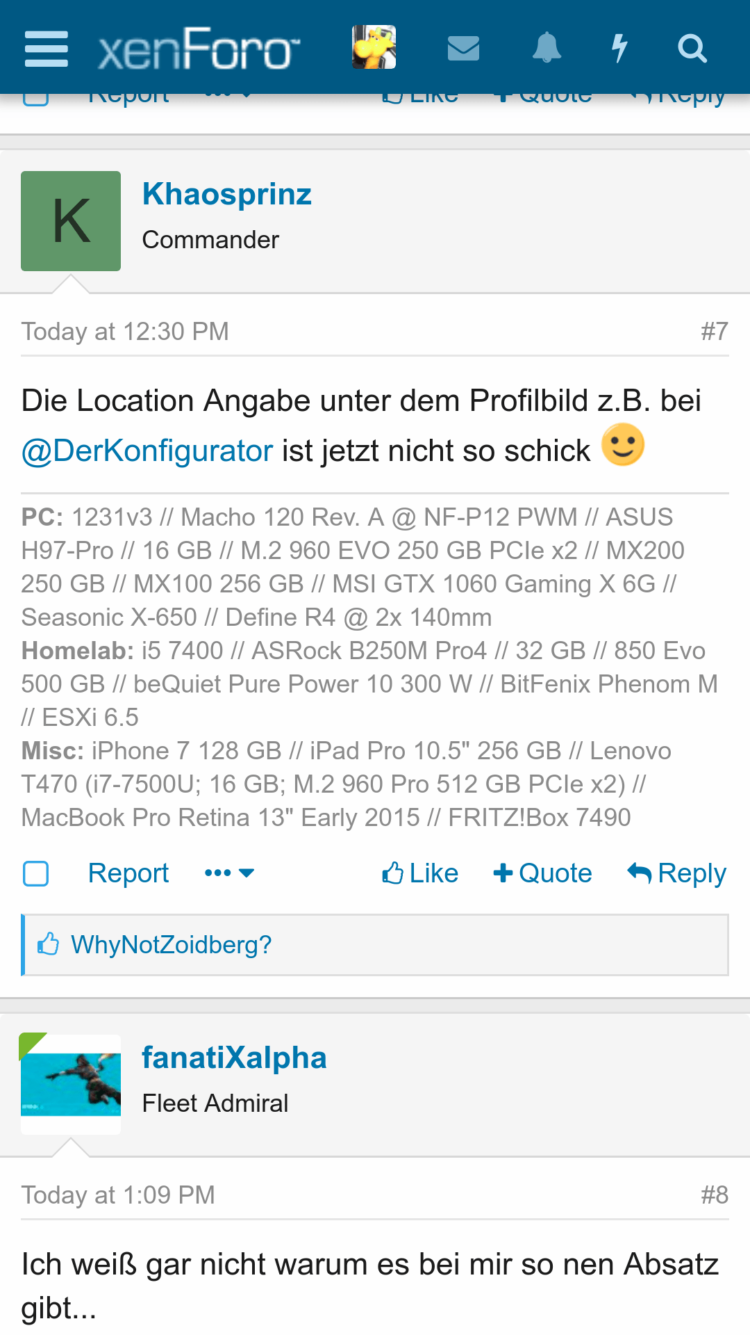Steffen schrieb:tl;dr: Das Problem mit abgeschnittenen Avataren wird ab dem nächsten Import in ein paar Tagen behoben sein. Zudem könnt ihr jetzt vorab ein hochauflösendes Avatar für das neue Forum hochladen, das zukünftig nach jedem Import automatisch in euren Account eingetragen wird.