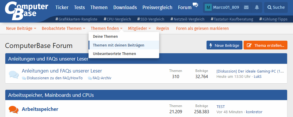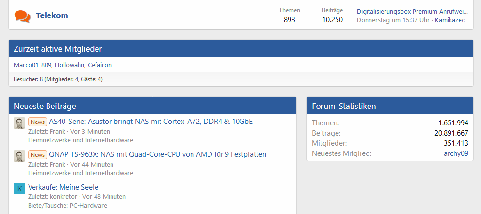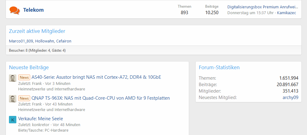 Wie oben gesagt schaue ich morgen mal bei die Themenliste in den Unterforen. Aber in der Themenansicht ist es ja nicht so, dass man eine bereits vorhandene Leiste anders einfärben könnte, sondern man müsste dazu eine neue Leiste einfügen (wodurch dann der Avatar etc nach unten rutschen und jeder Beitrag mehr Platz braucht, manche zählen hier ja fleißig Pixel, dann drehe ich das Argument jetzt mal um, auch wenn ich selbst es nicht überzeugend findeCMDCake schrieb:Respekt, die Änderung von Marco01_809 wurden ja fix übernommenSieht jetzt schick aus auf der Foren Übersicht. Dafür sehen die Unterforen noch so schrecklich aus, auf die müsste das Design natürlich auch übertragen werden, und in die Threads auch.