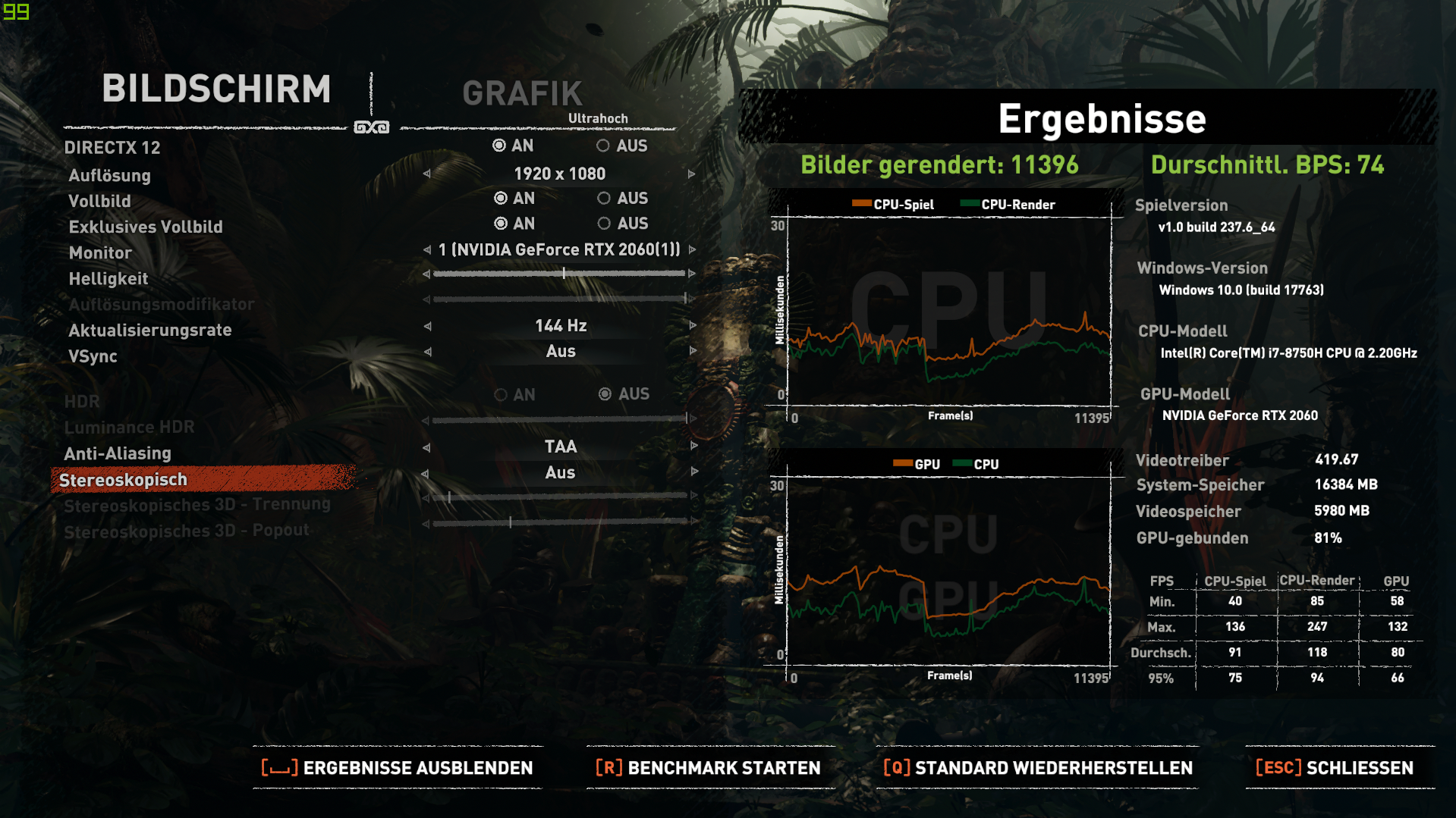 Nettes Ergebnis, trotz der 2GB weniger VRAM. Bin etwas verblüfft. Die Temperaturen waren Konstant CPU bei 70° und die GPU 60°, ohne große Veränderung. Ich werde mal ein wenig probieren, mal sehen, was sich rauskitzeln lässt.