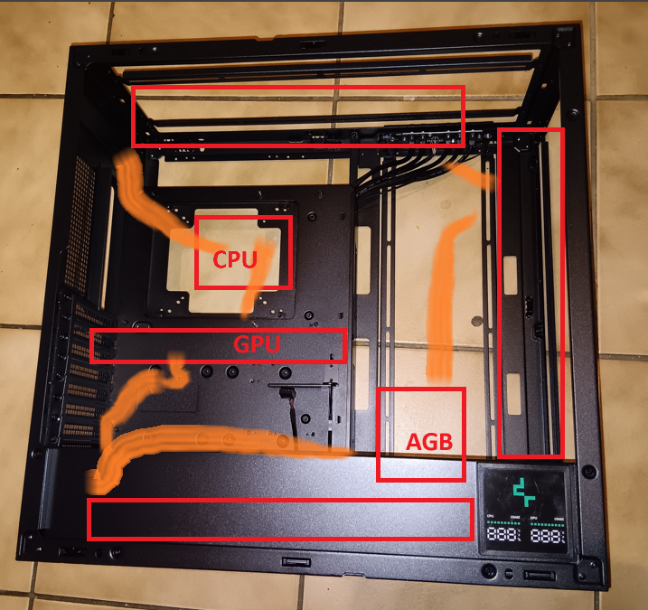 Winkel habe ich genug, oben würde ich jeweils 90 grad Winkel hinmachen damit der Schlauch gerade runterläuft. Aber genau da ist auch meine Sorge. Während es vorne richtung Front sicherlich passen wird, habe ich hinten eher angst ob das gut machbar ist mit der CPU. Ich glaube ich müsste den Schlauch stark knicken damit hier eine vernünftige Lösung entstehen würde oder ob überhaupt eine vernünftige Verbindung entstehen könnte.