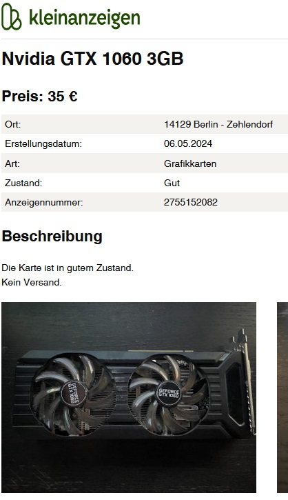 Dein Beispiel: Zustand "gut", Preis 35€. Und da gibt es zu 100% noch nen Haken.Kathdan schrieb:diese GPU bekommt man in sehr gutem Zustand schon ab 20€