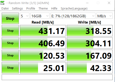 Die 1GB Werte sind ähnlivh, zeigen aber auch einen Wert um 48MB/s beim 4K Write an.
