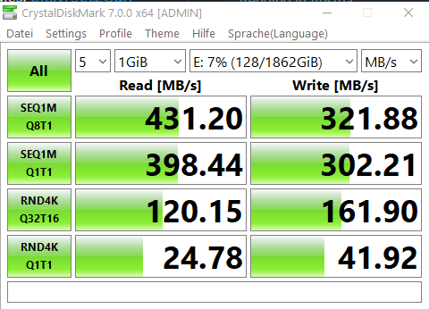 Kleines Update: dieses Mal direkt in einen Laptop (Thinkpad E495, 32GB RAM, 1TB NVME SSD für das BS, 3500u) verbaut.Tenferenzu schrieb:Ich weiß nicht ob ich hier hauptsächlich mein externes USB3.0 Gehäuse benche aber das sind die Werte meiner 2TB Sandisk SSD Plus: