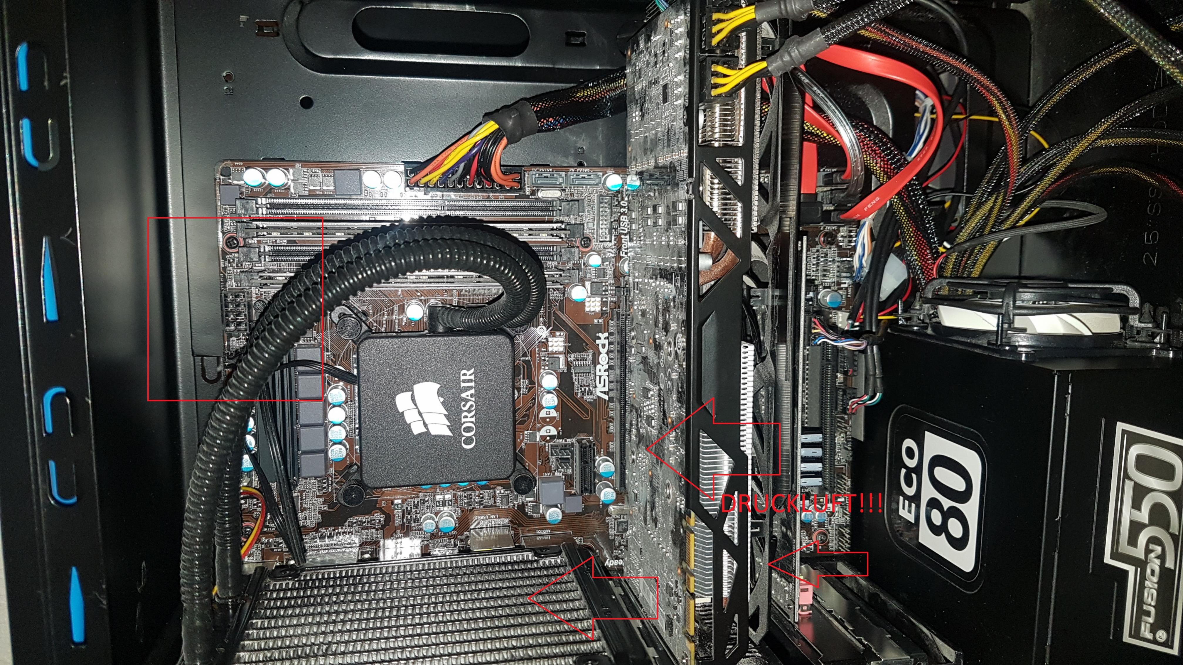 Außerdem solltest du DRINGEND den Rechner mal ausblasen mit Druckluft. Da gibt es Spraydosen für 2.50€ und gut.