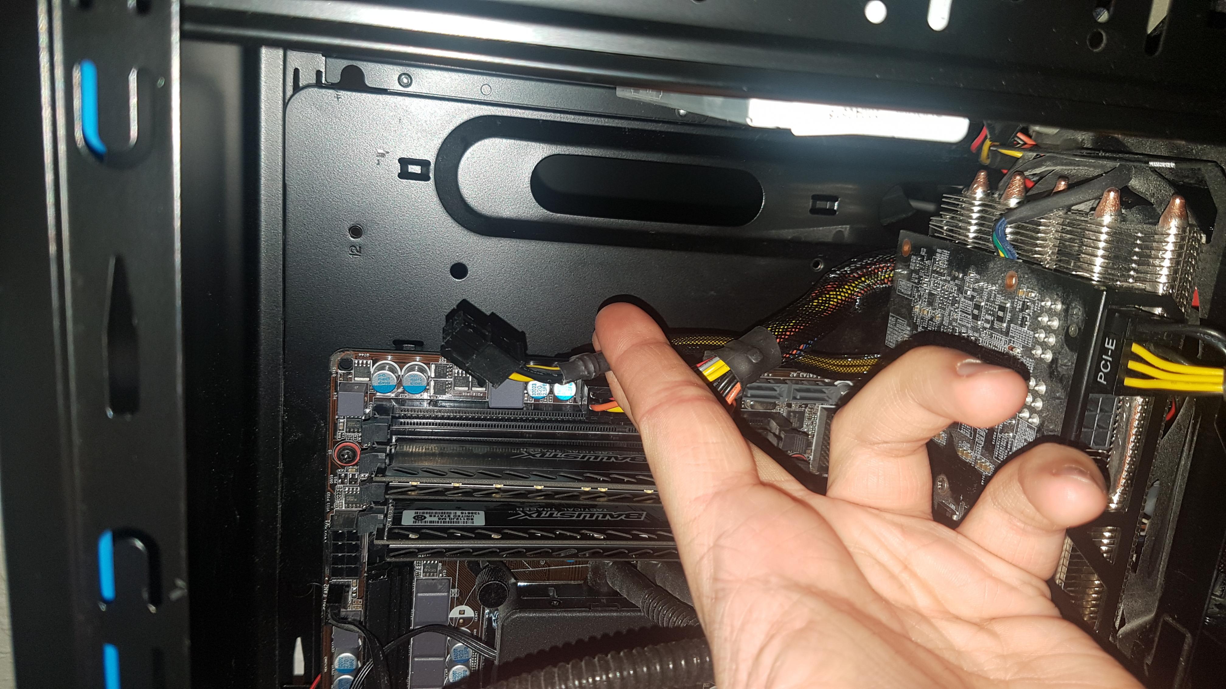 Dieser 4er Stecker ist zu 100% zu kurz um bis zum CPU Strom Anschluss zu kommen (siehe Bild 1) nur der 6er der in Grafikkarte steckte würde bis oben reichen...