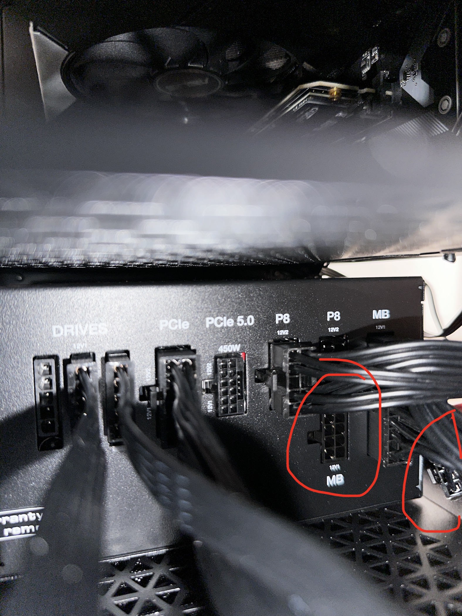 Man sieht auf dem Bild, das du vergessen hast am Netzteil den zweiten Stecker von dem großen 24 pin Kabelstrang anzuschließen. Am Netzteil sieht man da rechts die 12V1 MB Beschriftung
