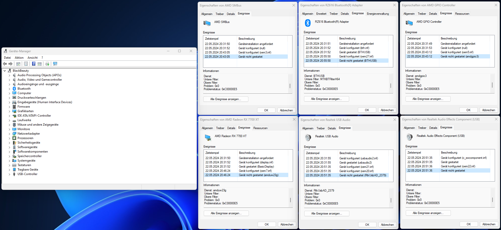 Geräte werden als "nicht gestartet" angezeigt - von der Uhrzeit her sollte das mit der Treiberinstallation nach der Windows 11 Neuinstallation als Lösungsversuch hinhauen: