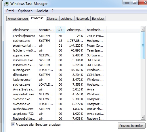 Im Leerlauf, also nur Desktop, Antivir und Taskmanager, zeigt mir letzterer an, daß 12%-15% CPU-Auslastung vorhanden sind. Ebenso knapp über 4 GB Arbeitsspeicher genutzt werden. Und das dauerhaft.