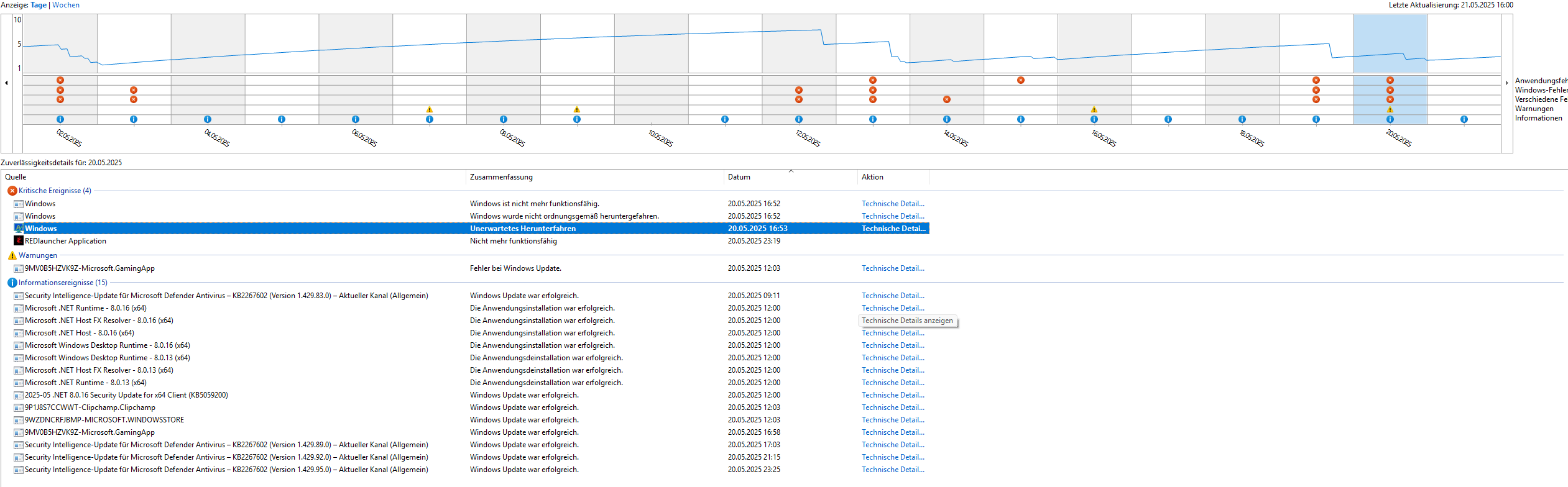 Die Ereignissanzeige und die Zuverlässigkeitsüberwachung geben keine näheren Infos und verweisen auf die Logs/Dumps.