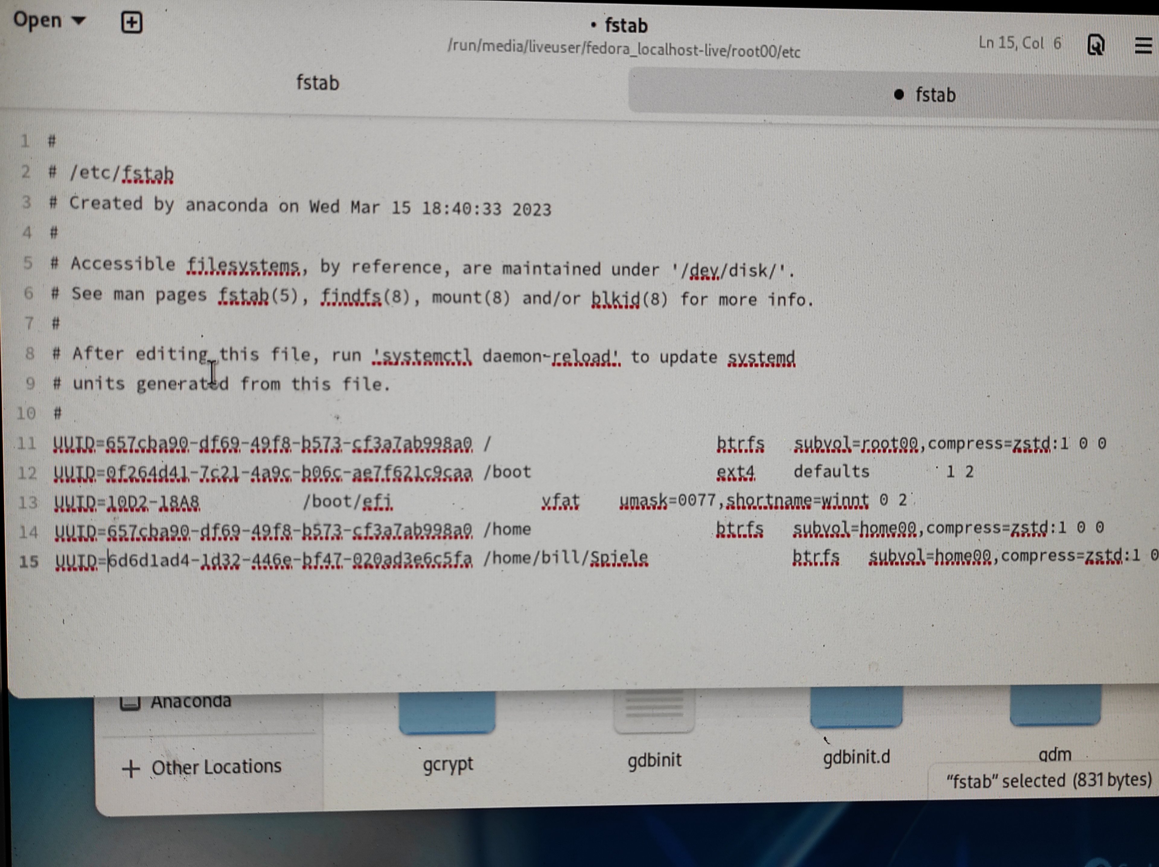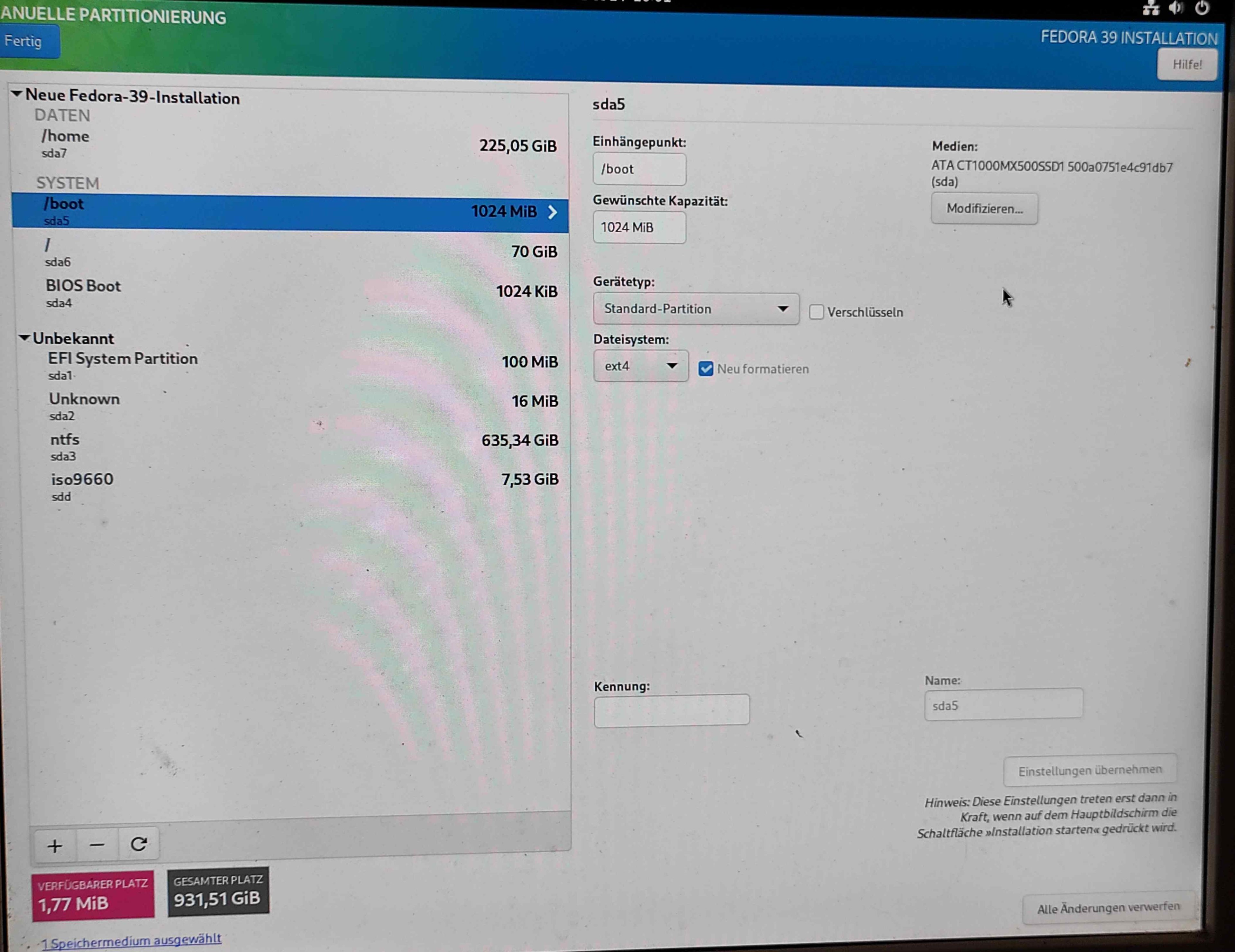 gelöscht hatte, per Gparted mit btrfs neu formatiert, und die fstab manuell editiert hatte (siehe Screenshot).