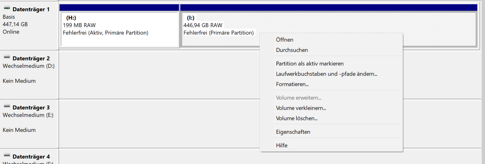 Datenträger 1 ist ein Platte (RAW) die von Windows nicht mehr gelesen werden kann.
