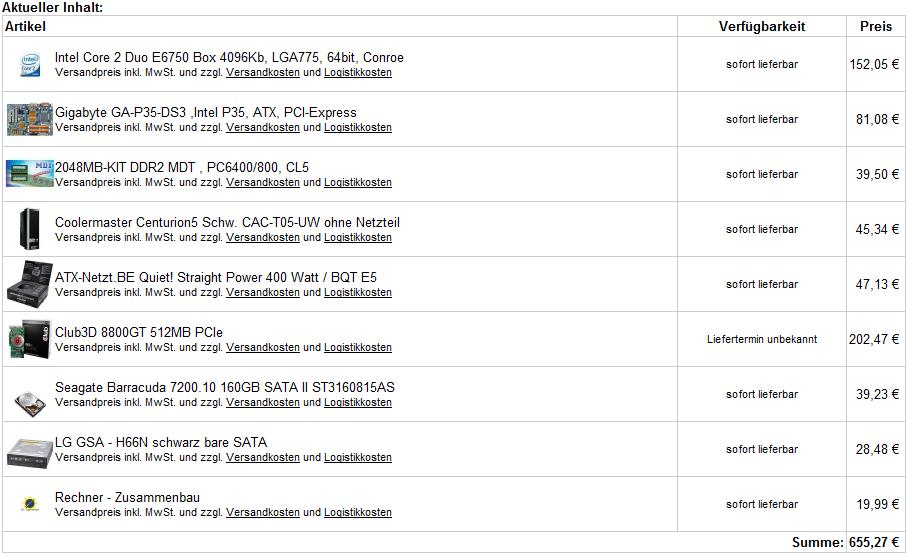 floschman schrieb:Das System was du dir zulegen willst, ist ne Katastrophe! Die 2 x 3 GHZ = 6 GHZ Rechnung sieht nach einem typischen unseriösen eBay-PC aus. Mit der 8600 GT ziehst du keinen Hering vom Teller.
