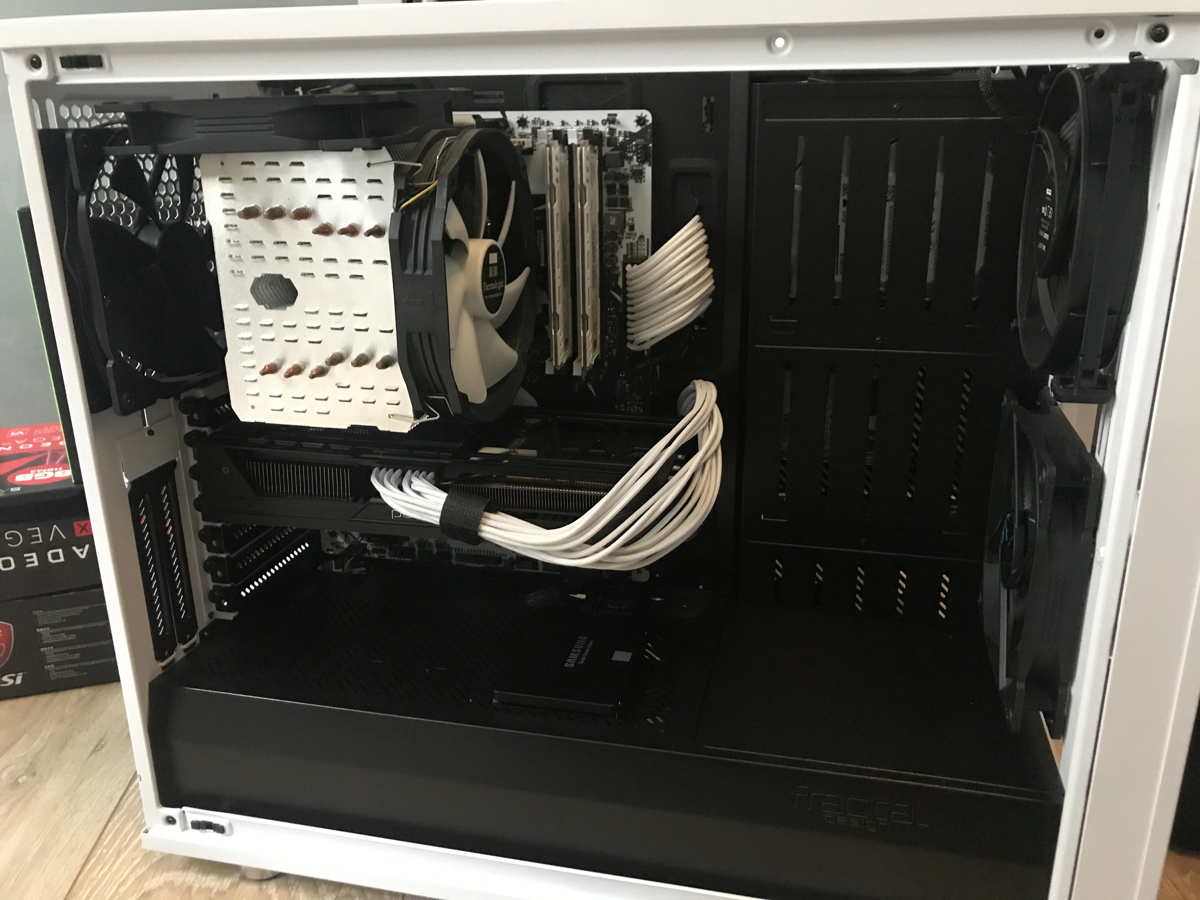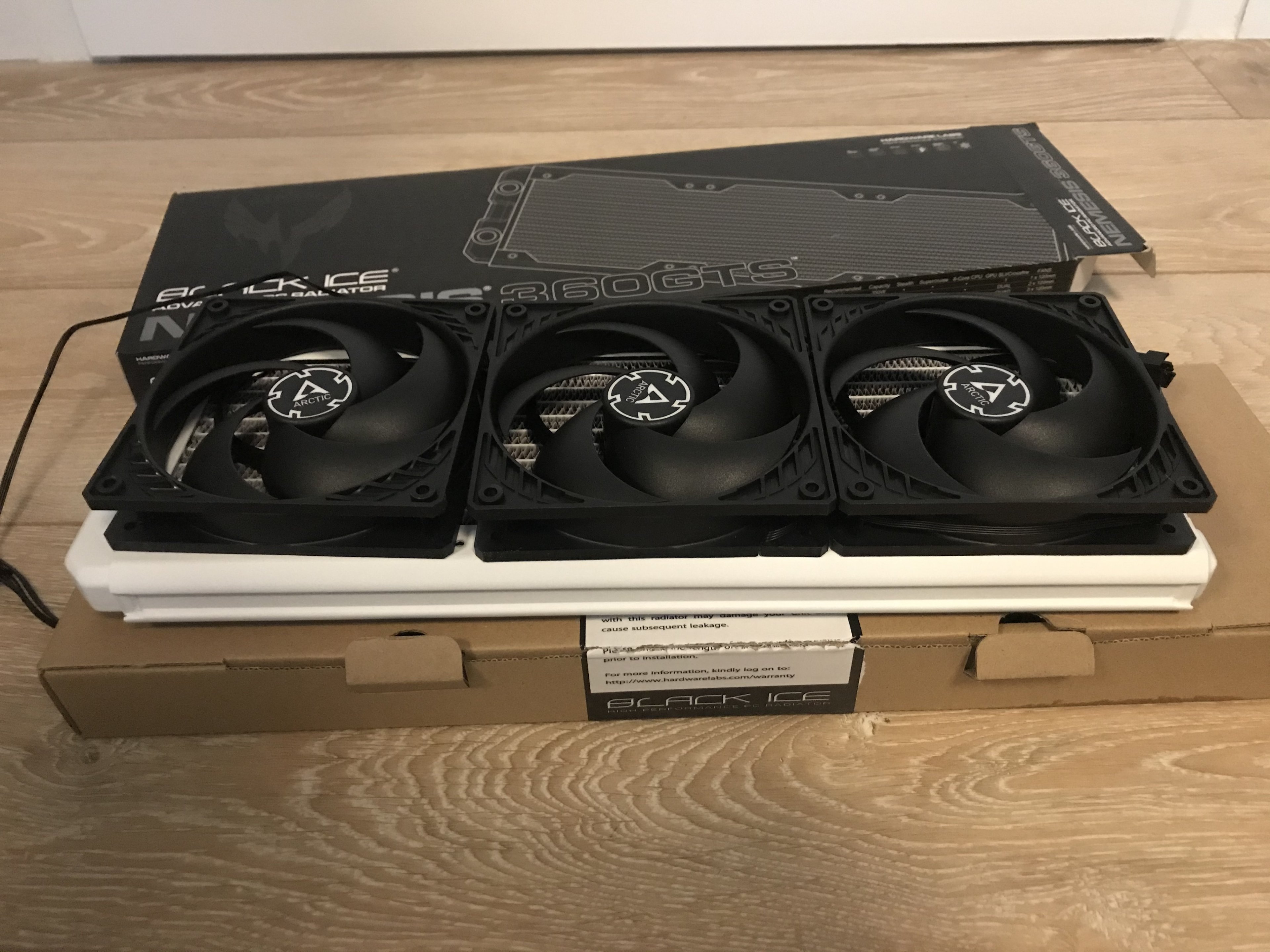 Die beiden GTS360-HW-LABS-Radiatoren sind auch top. In weiß sehen die Bombe aus und passen gut in mein Konzept. Dazu dann 6 Arctic Lüfter. Die Radiatoren hab ich vorher gründlich gereinigt und gespült.
