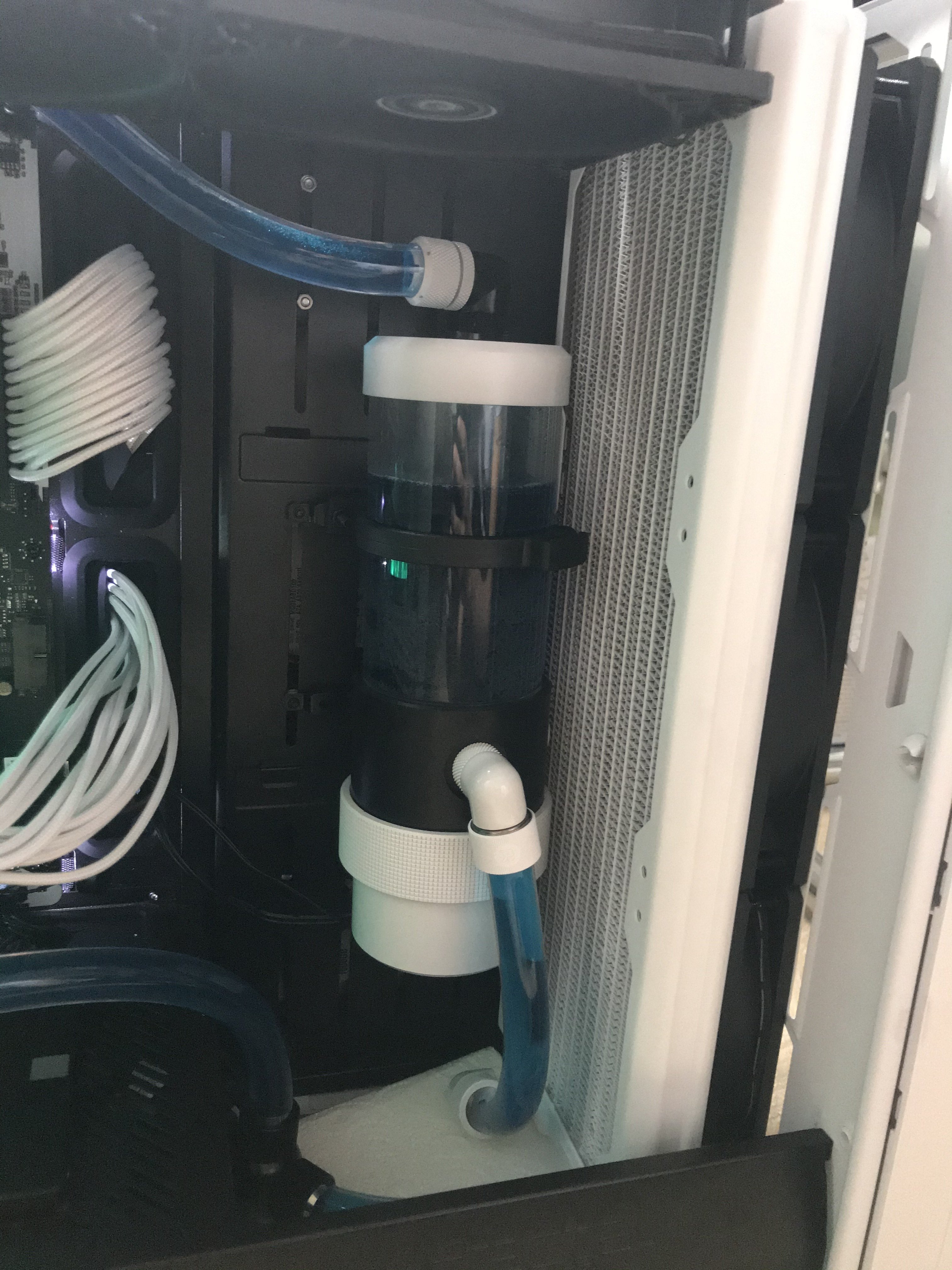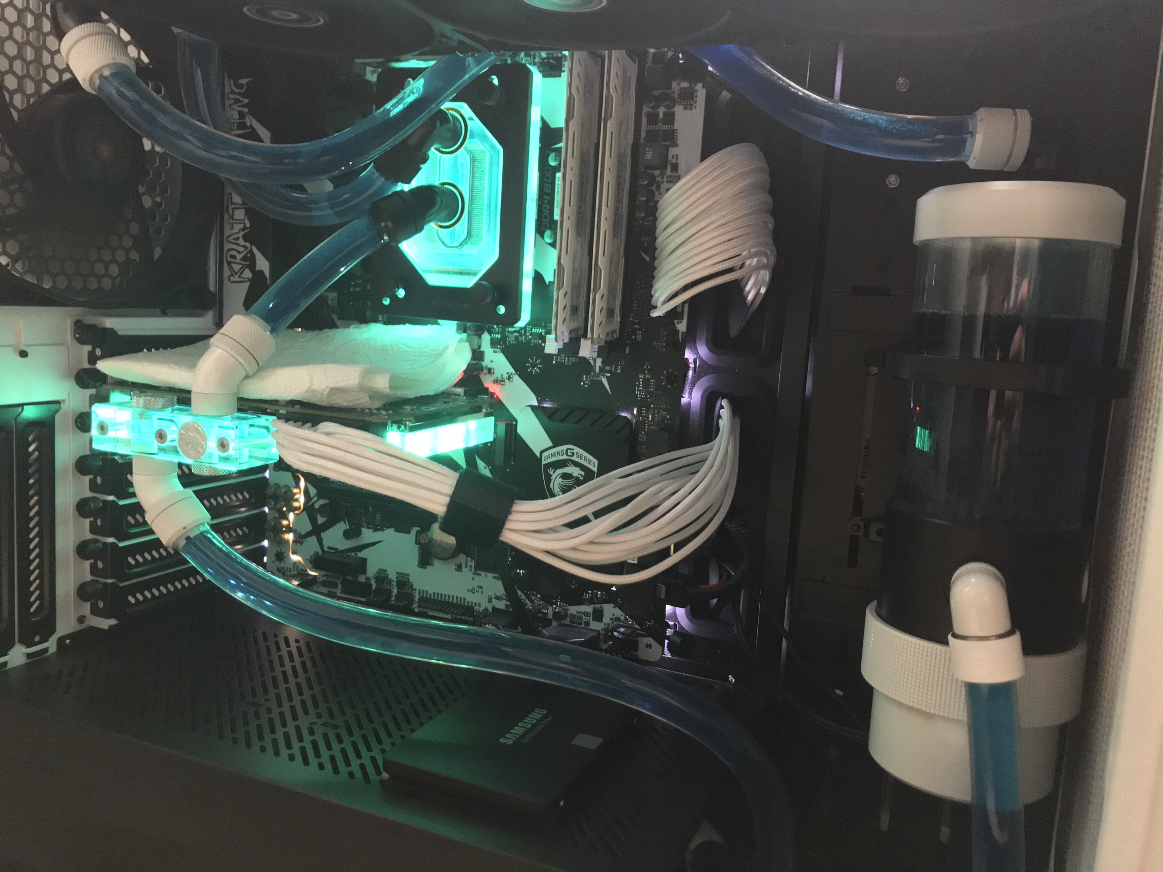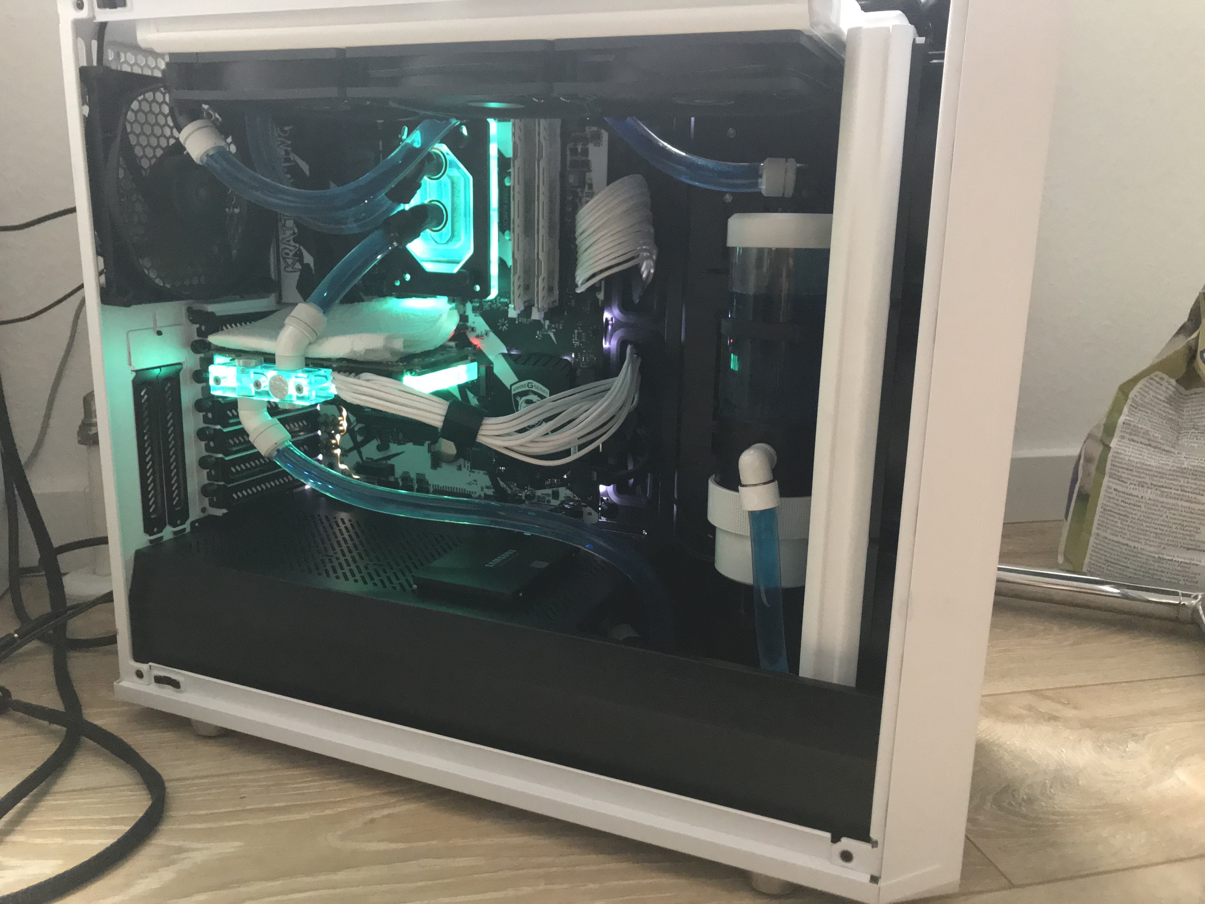 Einmal hab ich nach dem befüllen gemerkt, dass ich den oberen Blindstopfen nicht anschrauben kann wenn ich gleichzeitig oben einen normalen Fitting verschraube. Mit Winkel klappt es dann. Beim zweiten Mal war alles befüllt und ich hab die Pumpe laufen lassen während ich die Kabelverlegung angepasst habe und das LED-Modul und den Quadro eingebaut habe. Da bin ich an einen Schlauch am CPU-Kühler gekommen und es war undicht. Der Fitting war nicht komplett festgezogen. Also Eigenverschulden. Aber nun läuft alles