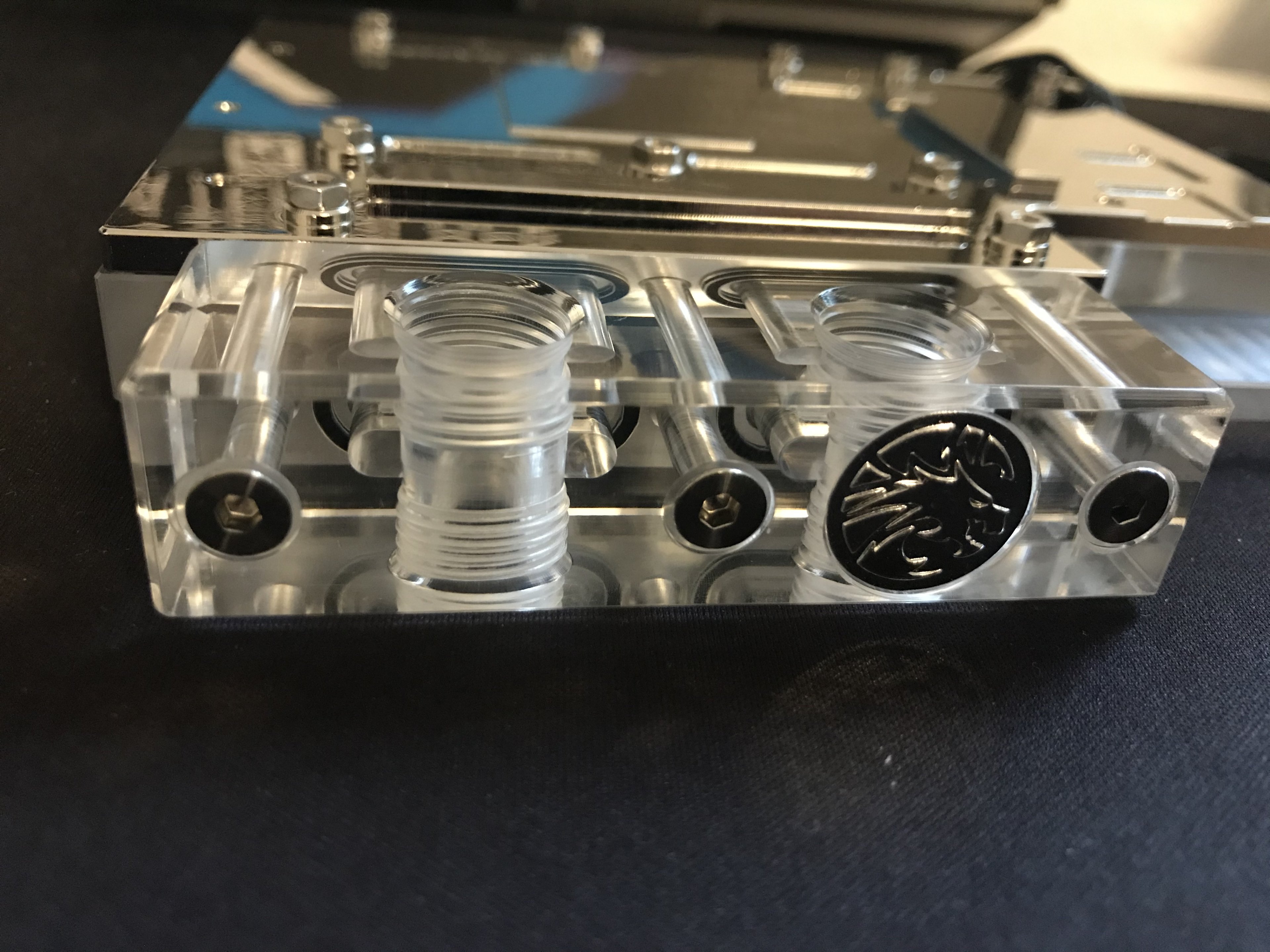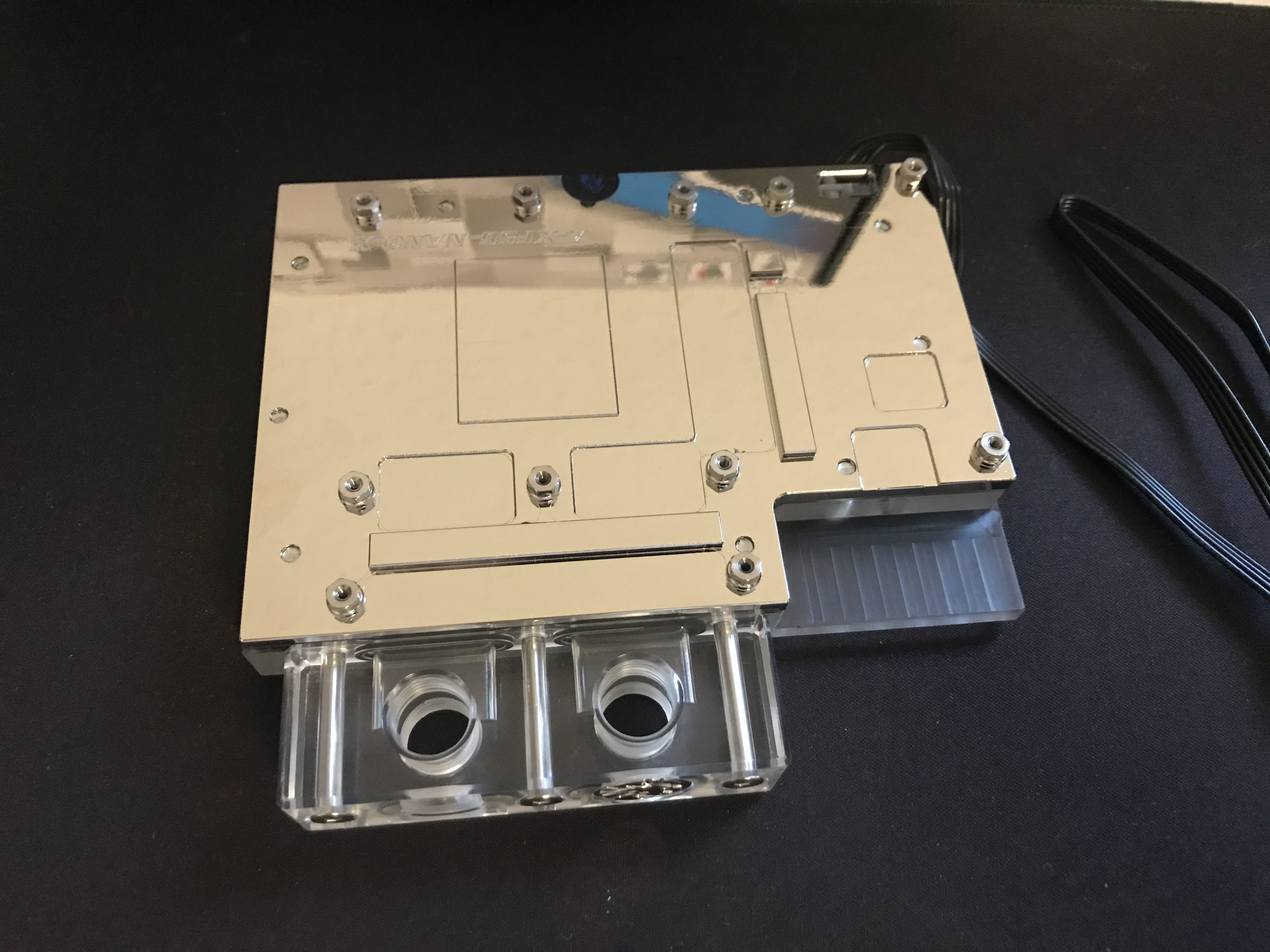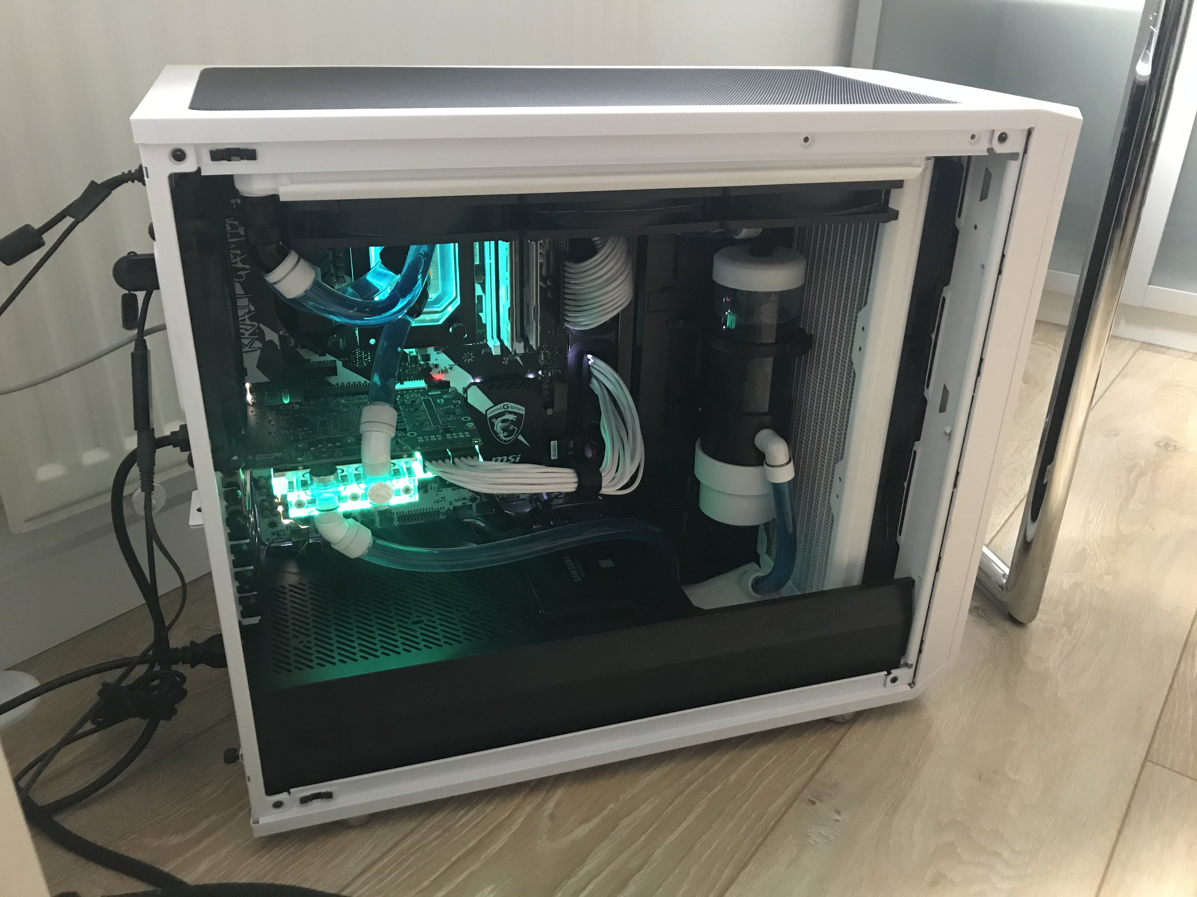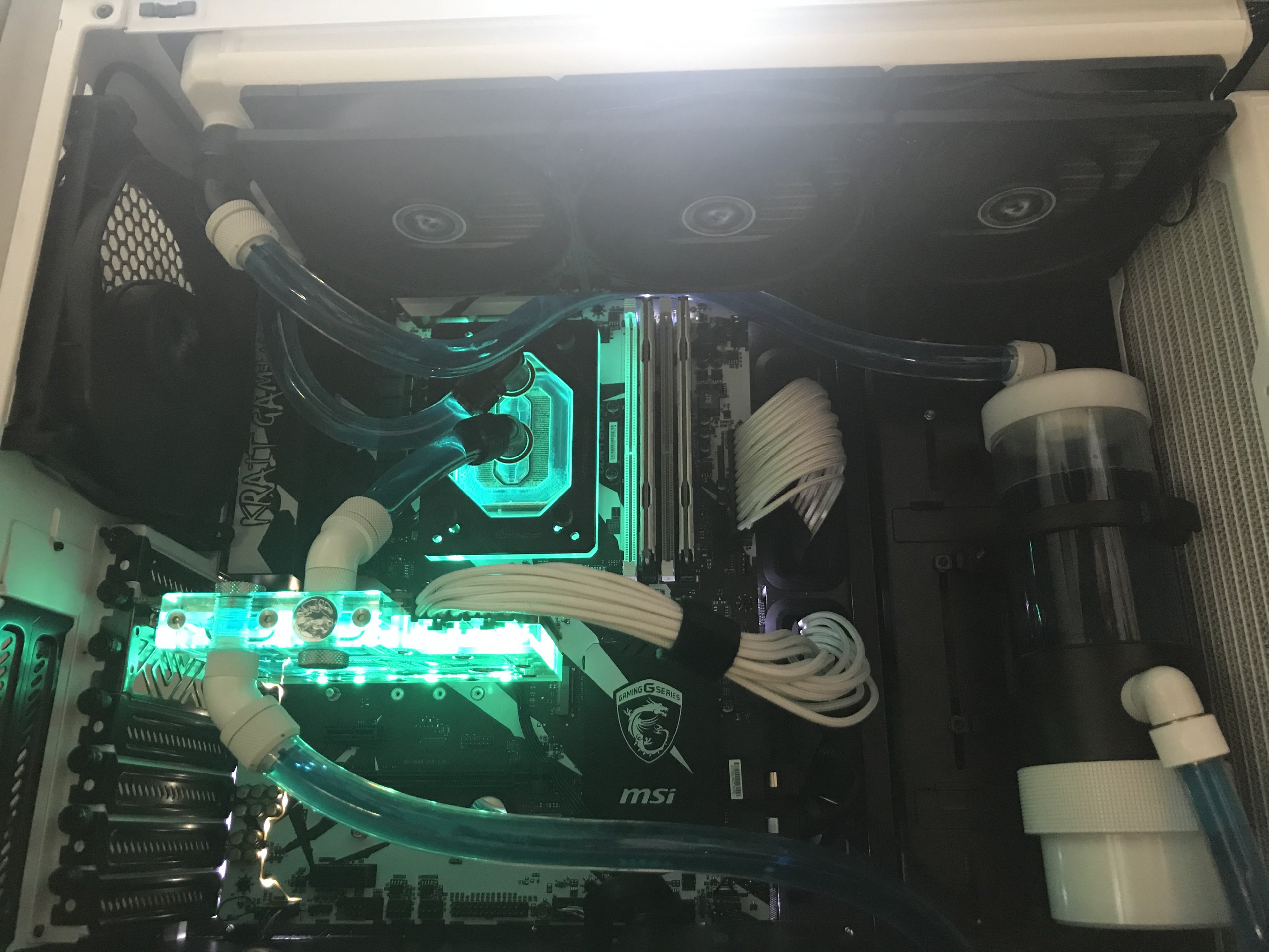 Einmal hab ich nach dem befüllen gemerkt, dass ich den oberen Blindstopfen nicht anschrauben kann wenn ich gleichzeitig oben einen normalen Fitting verschraube. Mit Winkel klappt es dann. Beim zweiten Mal war alles befüllt und ich hab die Pumpe laufen lassen während ich die Kabelverlegung angepasst habe und das LED-Modul und den Quadro eingebaut habe. Da bin ich an einen Schlauch am CPU-Kühler gekommen und es war undicht. Der Fitting war nicht komplett festgezogen. Also Eigenverschulden. Aber nun läuft alles