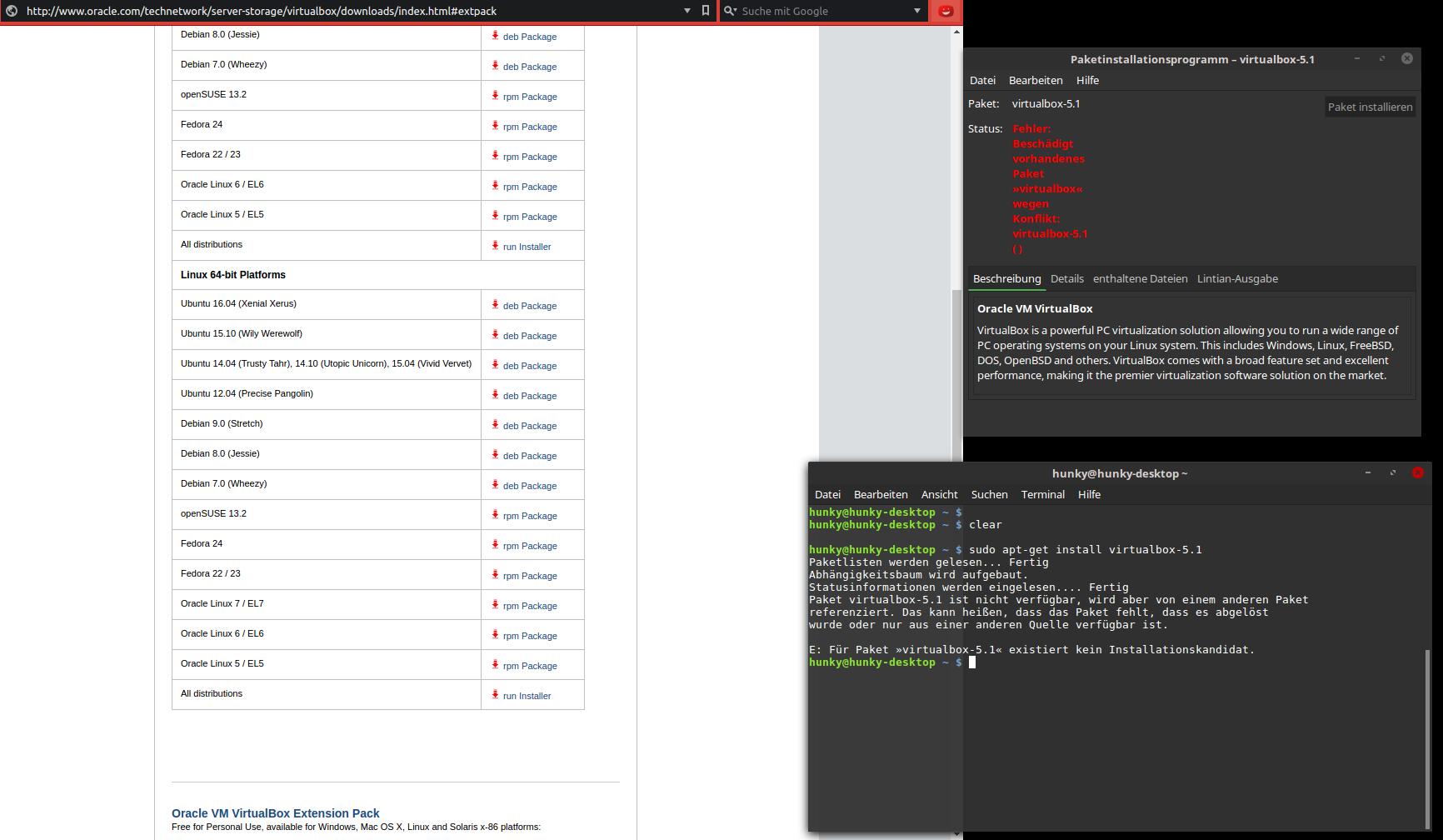 ich wollte ein Update auf Oracles Virtualbox 5.1 (da ich noch eine ältere Version benutze und das Zusatz-Paket benötige, für Usb2) machen. Nun habe ich die "ältere" Version deinstalliert, das System neu gestartet und die aktuelle Version heruntergeladen. Trotzdem möchte es nicht so wie ich will, und mir wird jedes mal, beim Versuch es zu installieren, ein Fehler ausgespuckt - auch lässt es sich nicht per Terminal installieren.