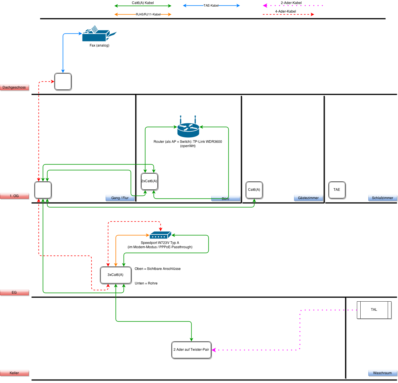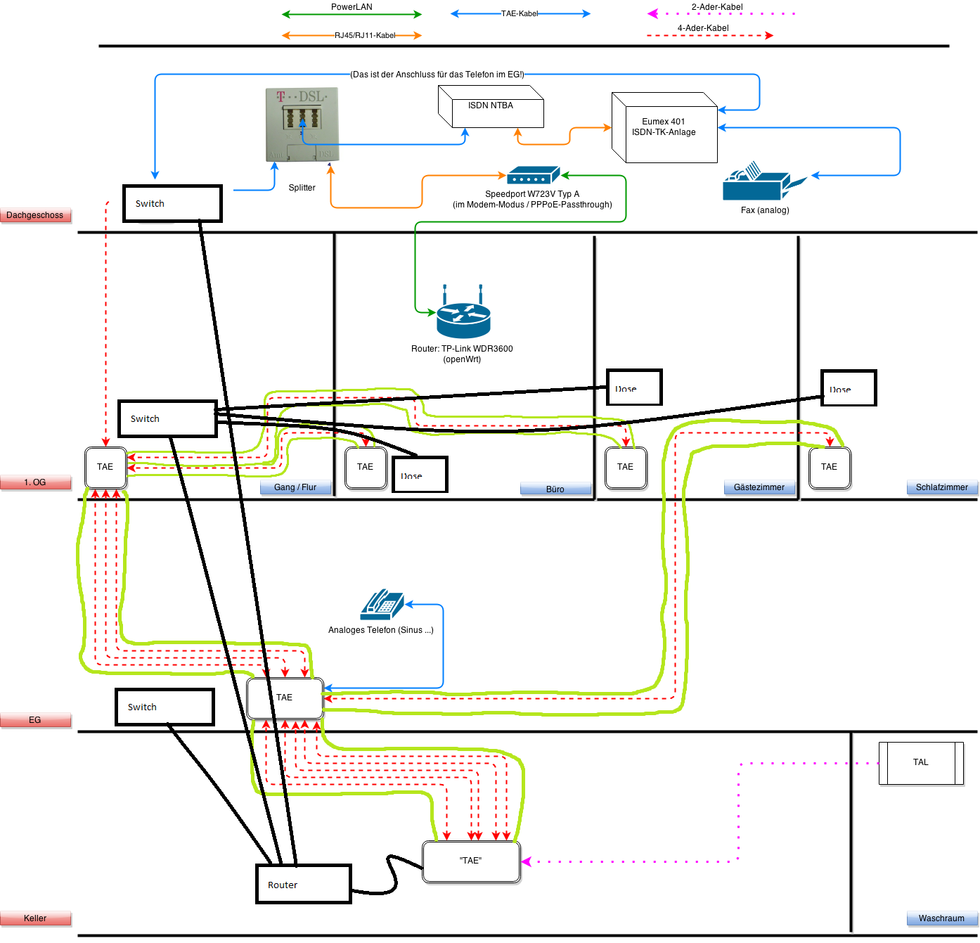 - Das 4-Ader-Kabel in den Dachboden von seinem Missbrauch befreien und im Keller an den Speedport und im Dachboden an das Fax anschließen.