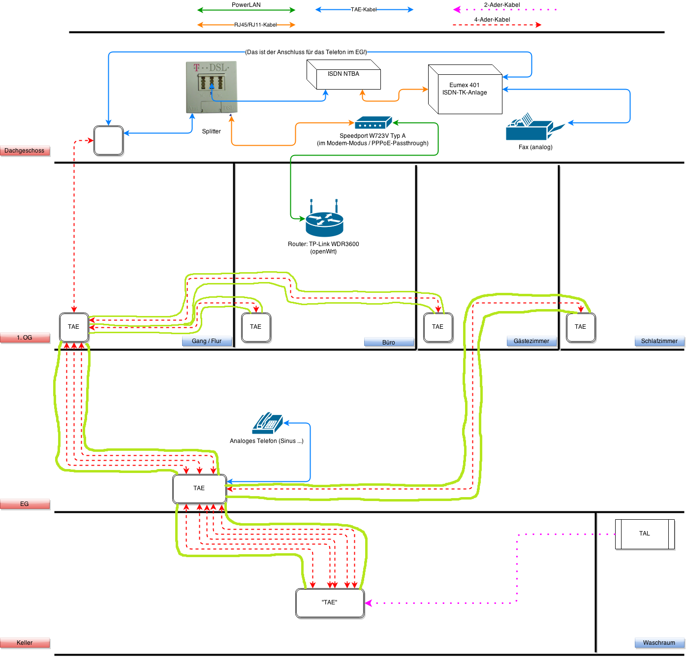 - Das Kabel zum Dachboden wurde "missbraucht". 2 Adern gehören dem DSL-Anschluss, der im Dachboden terminiert. 2 andere Adern gehören dem Telefonanschluss, der wieder zurück in den Keller läuft und dort dann umgeklemmt wird auf das Kabel, das vom Keller ins EG läuft und dort im Telefon "endet". Das hab' aber nicht ich gemacht also haltet euch mit Beschimpfungen zurück