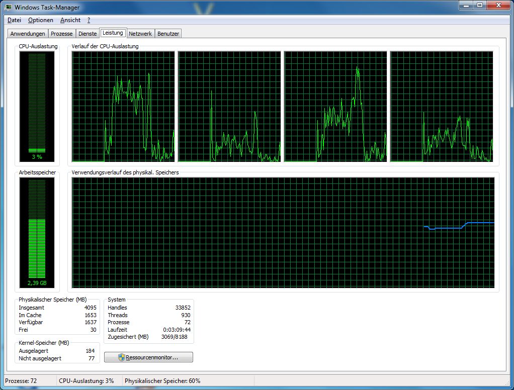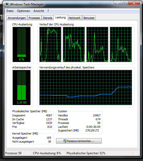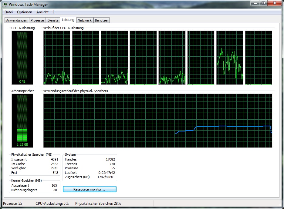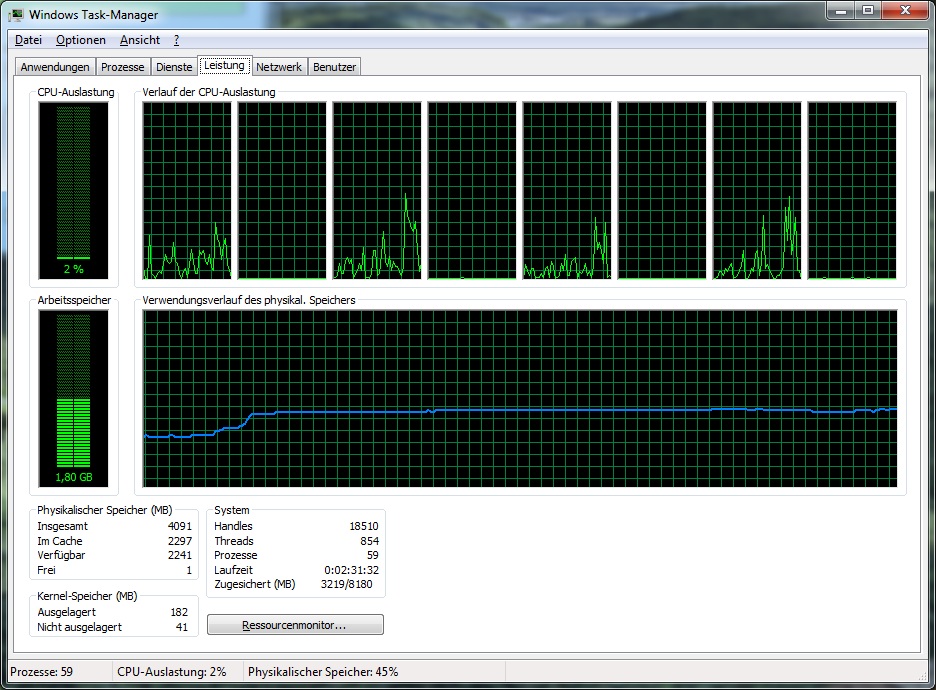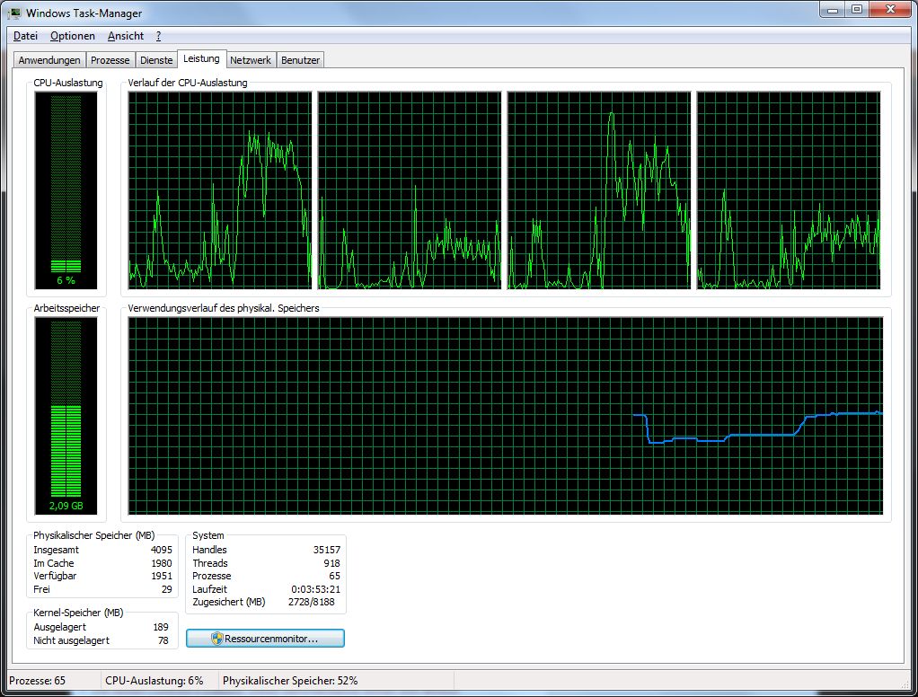 Könnt Ihr, wenn Ihr eine CPU mit mehr als zwei Kernen habt, mal nachsehen, wie sich die CPU-Auslastung bei euch verteilt? Werden nur zwei Kerne genutzt, oder alle vier? Dann würde ich meinen Rechner wohl kurzerhand etwas aufrüsten.