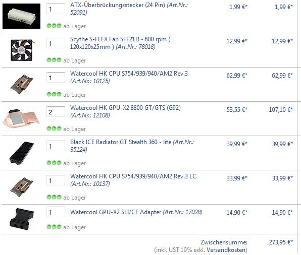 Ich habe mir für den Anfang folgenden Warenkorb zusammengestellt. Es fehlt noch Radiator, AGB, Pumpe, Schläuche und Anschlüsse. Lüfter hab ich schon.