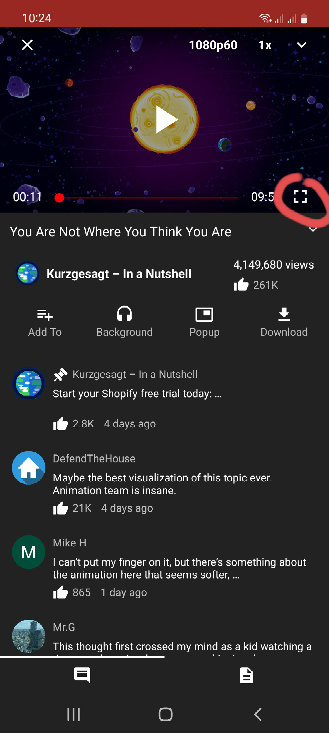 wenn autorotation beim phone aktiv ist, geht das video beim drehen ins querformat in den vollbildmodus. ist autorotation deaktiviert, hat man unten rechts im video-overlay das icon für den vollbildmodus.