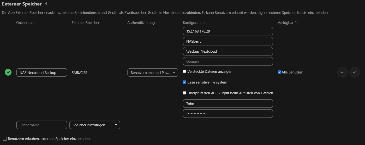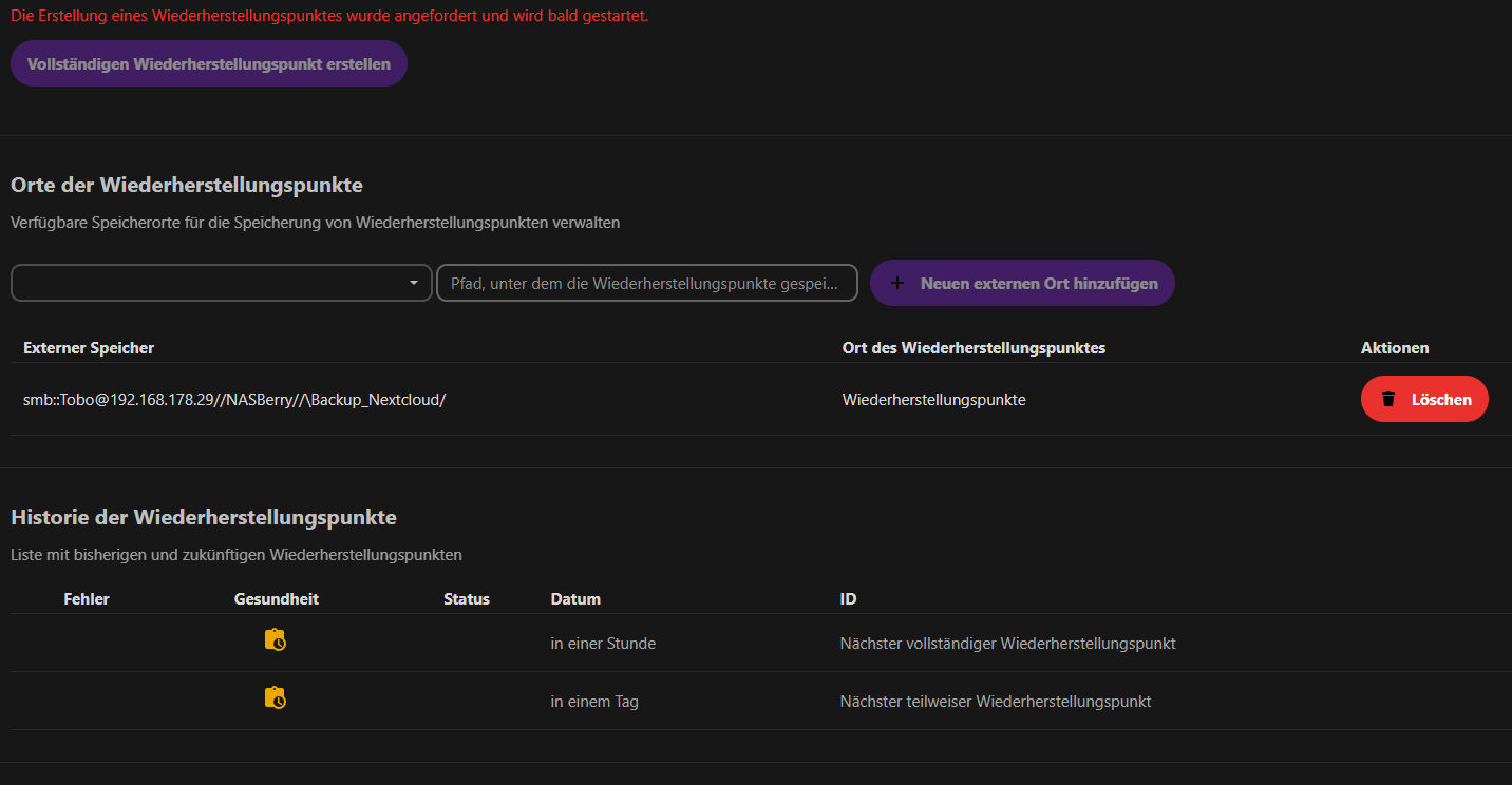 Mein Problem liegt bei meiner Nextcloud. Diese läuft auf einem anderen Gerät (MinisForum GK41) auf welchem Portainer mit mehreren Containern läuft. Ich habe bereits das NAS als externes Laufwerk in den Nextcloudsettings eingestellt und kann es auch im Backupfenster auswählen. Jedoch werden darauf die getimten Updates nicht aufgespielt.