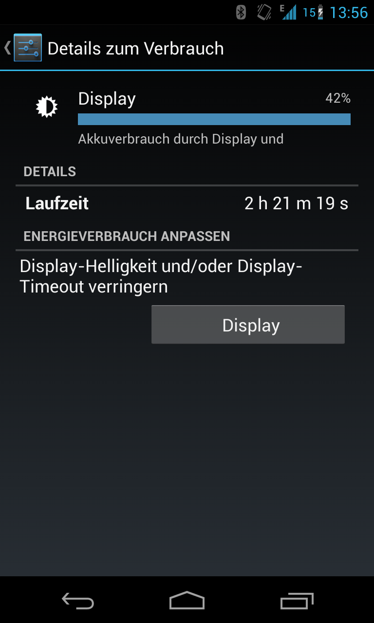 wie lange hält bei Nexus 4 Besitzern durchschnittlich der Akku bei welcher Nutzung? Bei mir ist es seit 2 Wochen ziemlich rapide abwärts gegangen mit der Akkulaufzeit. Hab heute um sieben Uhr früh bei 100 Prozent abgesteckt und sitze jetzt schon wieder mit dem Ladegerät hier, da der Akku leer ist. Habe etwa eine halbe bis ganze Stunde etwas gesurft, und zum Schluss noch auf 2G umgestellt, da ich sonst nimmer heim gekommen wär. Hat das Problem sonst wer? Oder hat mein Akku einen Schuss weg?