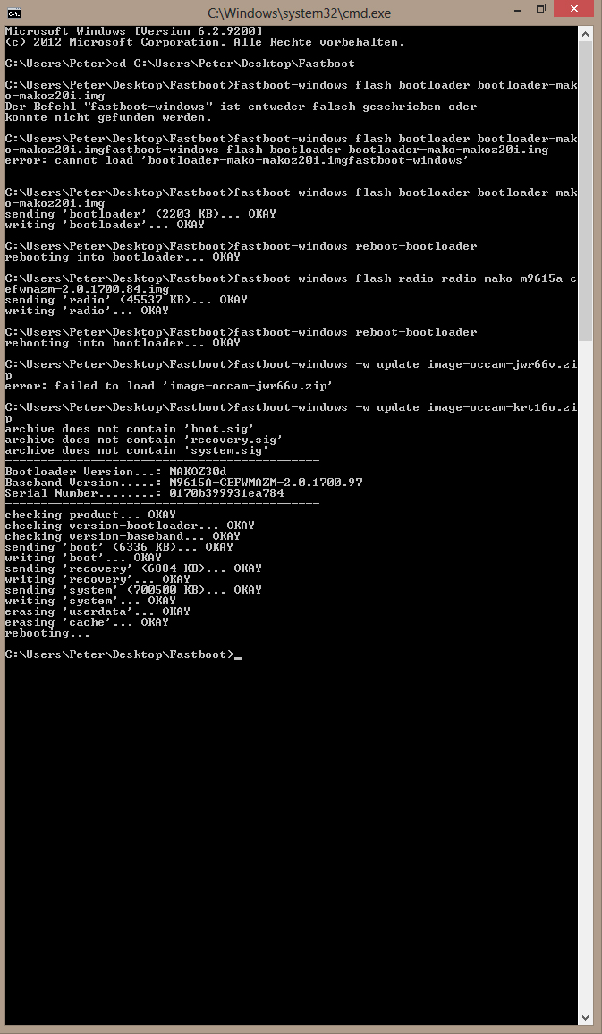ich habe gerade versucht auf mein Nexus 4 KitKat zu flashen, die Dateien sind direkt von Google heruntergeladen. Jetzt bleibt das Nexus bei dem Bunten "Nexus"-Logo stehen ... das war's dann. Findet Jemand einen Fehler?
