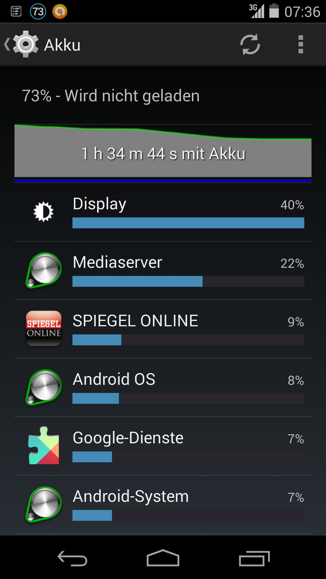 Heute aber ist mein Aku jetzt etwa 80 Minuten nach dem laden auch nur noch bei 73%. Das kommt mir doch sehr wenig vor, zumal ich besagten extremsauger Googlenow deaktiviert habe. Allerdings finde ich in meiner Akkuanzeige auch einen besagten Mediaserver, der 24% meines Akkus abgesaugt hat. Was für ein Medianserver? Und irgendwelche Googledienste auch nochmal 7%.