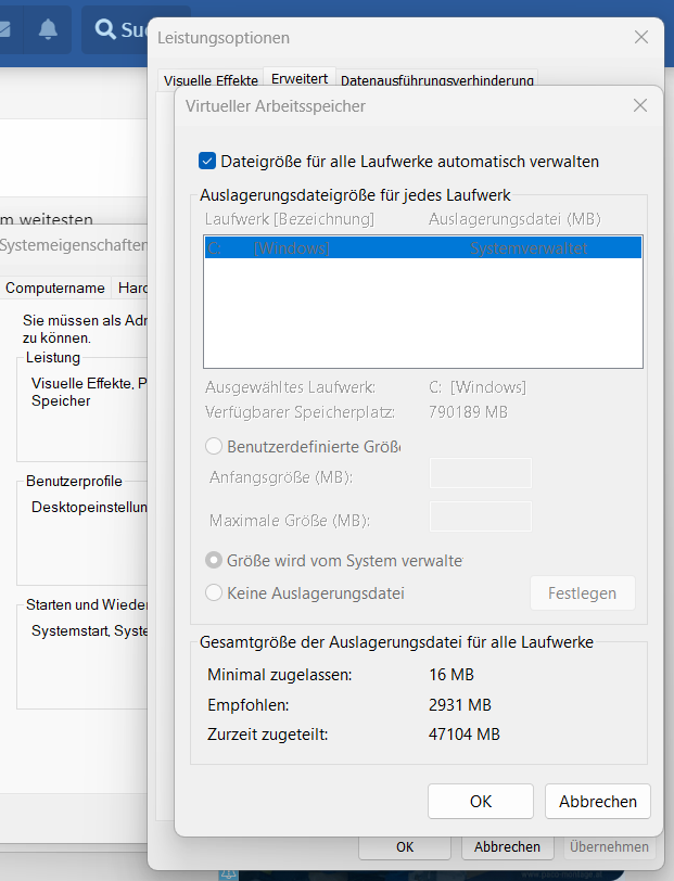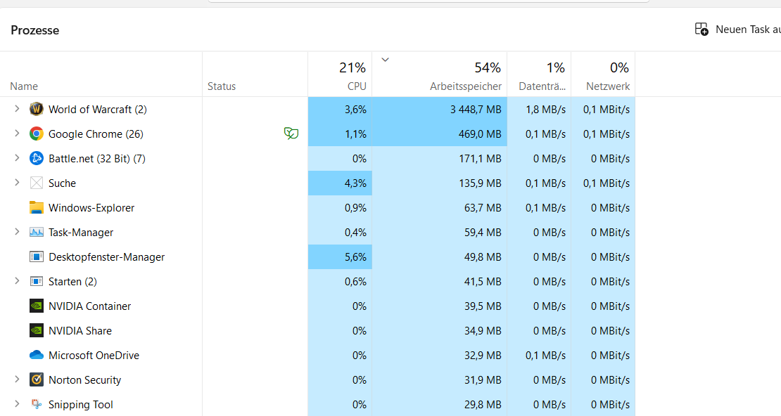 Leider habe ich keinen Screenshot von der genauen Meldung, aber sinngemäß steht drin dass zu wenig Arbeitsspeicher vorhanden ist. Neu ist dass nun auch das vorinstallierte Virenprogramm Norton während dem spielen eine Meldung aufploppen lässt bzgl. CPU Auslastung.