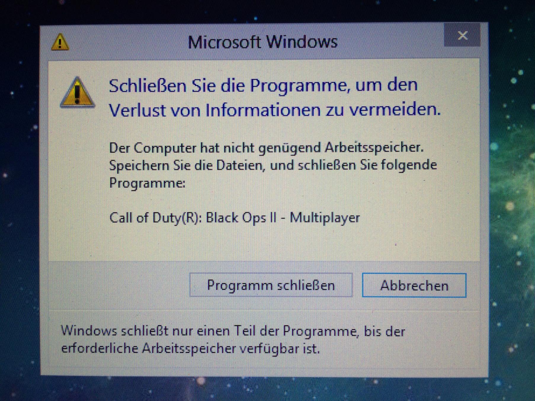 Schließen Sie die Programme, um den Verlust von Informationen zu vermeiden.Der Computer hat nicht genügend Arbeitsspeicher. Speichern Sie die Dateien, und schließen Sie folgende Programme: Call of Duty Black Ops II Multiplayer.(Siehe Foto im Anhang)
