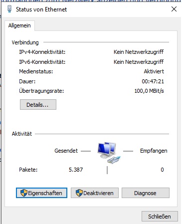 Ethernet fiel komplett aus (gelbes Rufzeichen in der Taskleiste). Die automatische Problembehandlung konnte keinen Fehler identifizieren. Irgendwoher aus dem Urwald erhielt ich den Hinweis: "Ethernet verfügt über keine gültige IP-Konfiguration." Aber alle mir bekannten herkömmlichen Maßnahmen brachten keine Abhilfe!