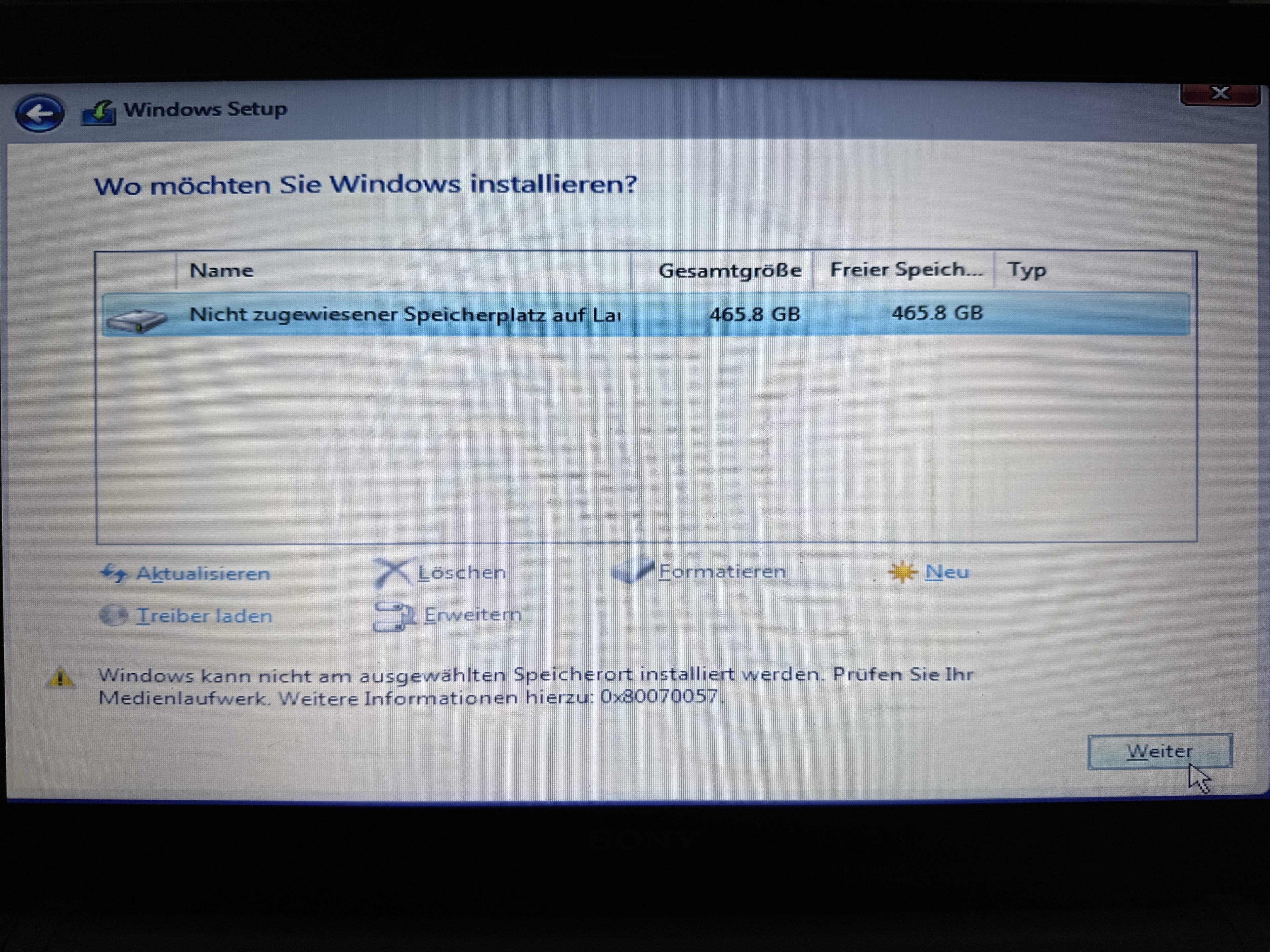 Ich habe alles probiert, aber es ist nicht möglich, Win 10 zu installieren, da keine Partiton erstellt werden kann.