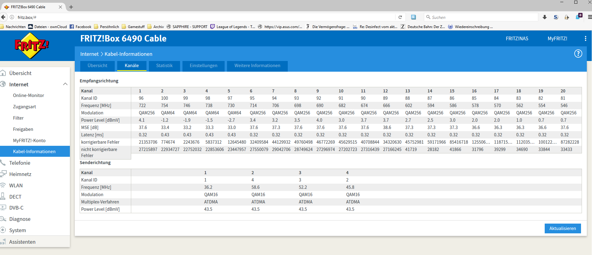In der Fritz.box ist der Wert der "nicht korrigierbaren Fehler" pro Kanal im unteren !!!8-stelligem!!! Bereich und während meiner Beobachtungen ist der Wert pro Kanal um ~ 1 Mio gewachsen (eine Stunde).