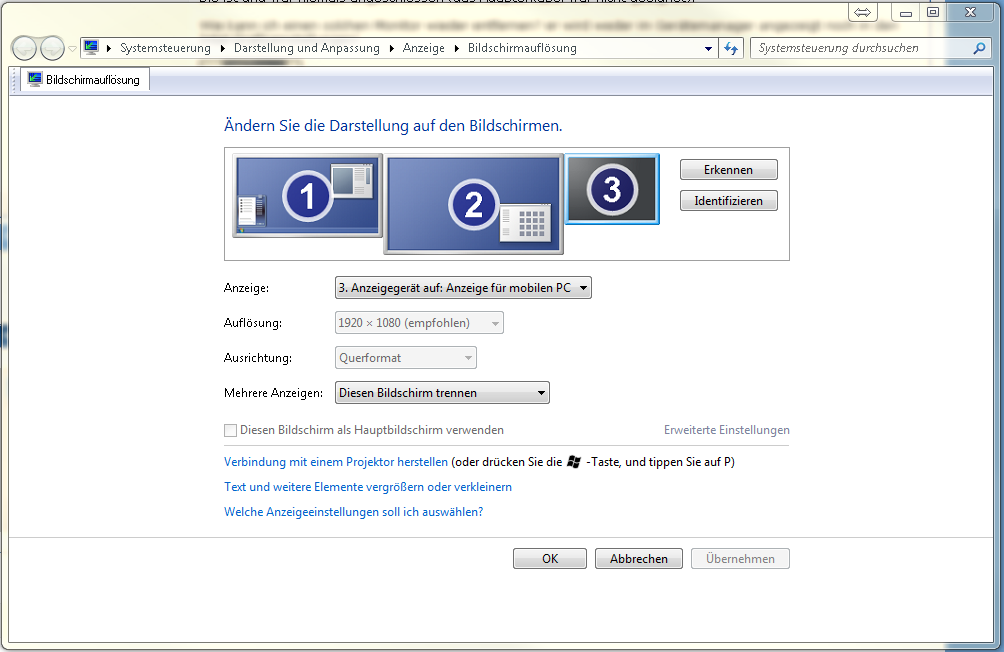 Vor einiger Zeit habe ich mal versucht einen Monitor über einen mini-DP->DVI-adapter an meinen Laptop anzuschließen. Bei diesen versuchen hab ich irgendwie einen Monitor manuell zu Win 7 hinzugefügt (Monitor 3 im Bild).