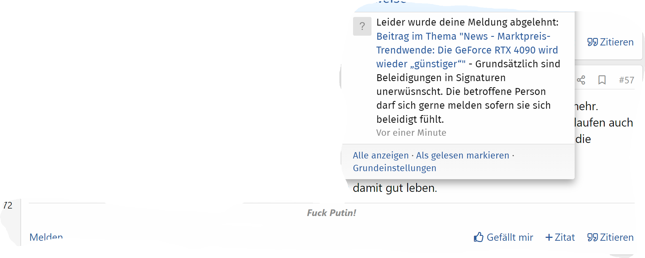 vorhin habe ich einen Beitrag/Signatur gemeldet, der so ziemlich eindeutig beleidigend ist.