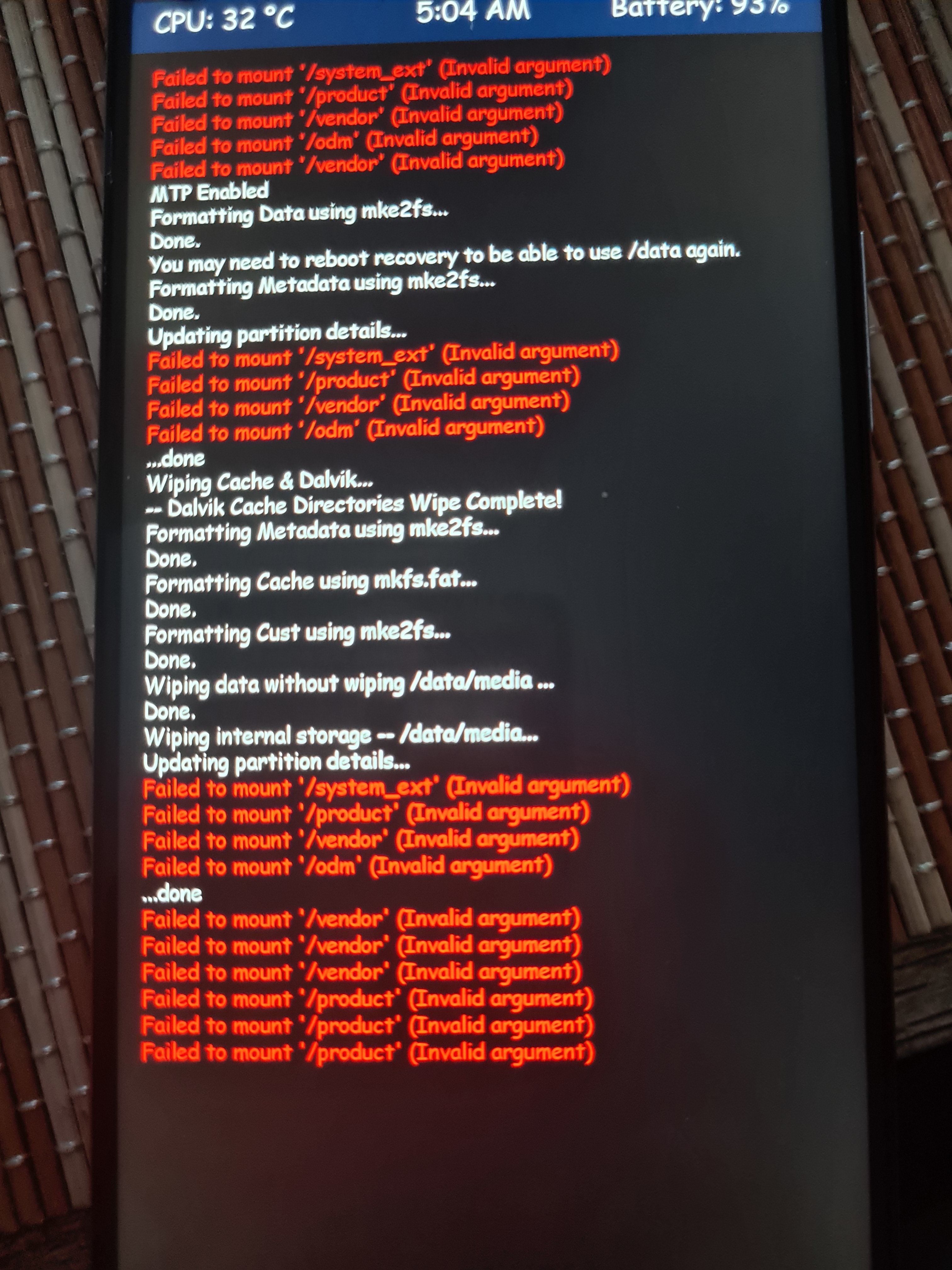Ich habe ein Problem, ich wollte ein Update von MMX installieren, um auf Android 12 zu updaten, leider wurde daraus nichts. Ich verstehe einfach nicht, warum das nicht funktionierte. Ich habe versucht das Gerät komplett zu formatieren selbst das funktionierte nicht. Ich weiß nicht weiter, ich habe jetzt einen offiziellen Stock installiert als .tgz selbst dort bekomme ich Fehler Meldung bei der Installation. Ich nehme mal ganz stark an das irgendwas das Blockiert oder sogar sperrt, weil wenn ich ihn denn Befehl gebe alles zu formatieren und alles zu löschen dann verweigerte das Gerät mir es als ob ich nicht die rechte dazu hätte, das ärgert mich.